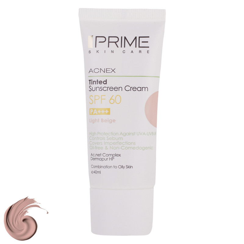 کرم ضدآفتاب رنگی پرایم مدل Acnex Beige SPF60، مناسب پوستهای چرب، حجم 40 میلیلیتر