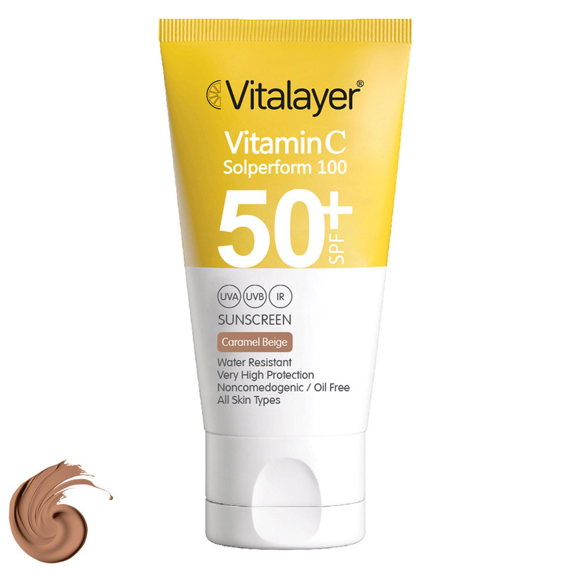 فلوئید ضدآفتاب رنگی ویتالیر، 50 SPF، مدل Vitamin C، مناسب انواع پوست تنالیته رنگ متوسط و حجم 50 میلیلیتر، ضد آب، محافظت کننده در برابر اشعه UVA، UVB، IR، آنتیاکسیدان، فاقد چربی و پارابن، ضد لک، آبرسان، دارای فرمولاسیون غیرکومدونزا، با ماندگاری 2 ساعته