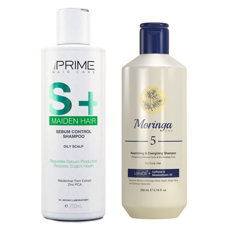 شامپو مو پریم مدل +S حجم 250 میلی لیتر به همراه شامپو مو مورینگا امو مدل S5 حجم 200 میلی لیتر