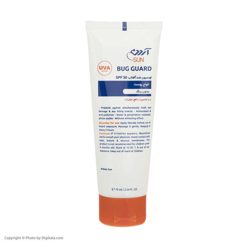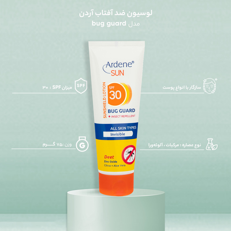 لوسیون ضد آفتاب مخصوص دافع حشرات آردن از تمامی پوستها در برابر پرتوهای مضر نور خورشید محافظت میکند. این لوسیون با انواع پوست سازگاری دارد و مناسب برای صورت و بدن میباشد. همچنین خاصیت دور کنندگی حشرات را دارد. حاوی زینک اکساید، مرکبات، آلوئه ورا است. همجنین به دلیل بیرنگ بودن قابل استفاده هم برای آقایان و هم خانمهاست. لوسیون ضد آفتاب مخصوص دافع حشرات آردن برای مسافرت و رفتن به مناطق کویری و مکانهایی که احتمال وجود حشرات باشد بسیار مناسب است.