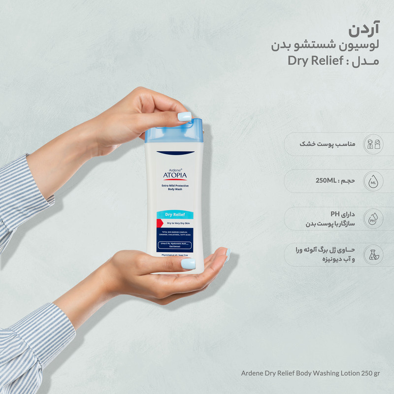 لوسیون شوینده و مرطوب کننده درای ریلیف، حاوی 5% اوره است. این درصد از این ماده، قدرت رطوبترسانی فوقالعادهای دارد. همچنین قادر به برطرف کردن لایهی فرسودهی پوست است که این ویژگی با توجه به ماهیت محصول بسیار خوشایند به نظر میرسد. تامین رطوبت پوست در این شوینده، توسط هیالورونیک اسید، اسیدهای چرب، کلسترول و سرامید موجود در محصول نیز صورت میگیرد.