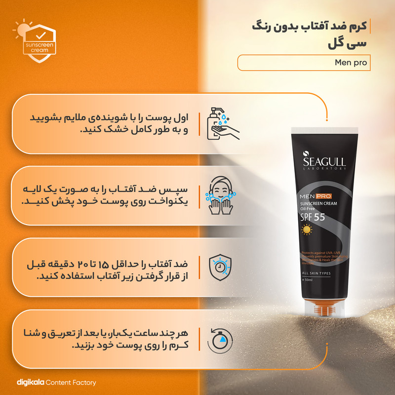 اگر میخواهید که اشعههای آفتاب بر روی پوست شما اثر مخرب نداشته باشند، فرقی ندارد که زن باشی یا مرد، استفاده از ضد آفتاب را جدی بگیرید. ضد آفتاب میتواند پوست شما را در برابر اثرات منفی که اشعههای مضر خورشید بر روی آن میگذارد، محافظت کرده و از بوجود آمدن چینها بر روی پوست جلوگیری کند. برند سی گل سری ضد آفتابهای خود را تحت نام Sun Pro ، برای حالتهای مختلف عرضه کرده که هر کدام از آنها با دارا بودن خواصی، میتوانند از پوست مراقبت کرده و حتی آنرا تقویت و یا ترمیم کنند. یکی از این محصولات، کرم ضد آفتاب مخصوص آقایان با SPF55 است. این تیوپ 50 میلی لیتری حاوی ترکیباتی از فیلترهای فیزیکی و شیمیایی، آلوئه ورا و ویتامین E است. این کرم حفاظت از پوست را در برابر تمام طول موجهای ماورا بنفش A وB و مادون قرمز در زمانی طولانیتر فراهم میآورد. تسهیل اکسیژن رسانی و رطوبت رسانی قوی در کنار غیر جوشزا بودن و فاقد چربی بودن این ضد آفتاب باعث شده تا برای استفادهی آقایان و البته خانمها نیز قابل استفاده باشد. از خواص دیگر این ضد آفتاب غیر مرئی (Invisible) بودن آن است. استفاده از ضد آفتاب میتواند ضمن ابجاد سد محافظتی قوی در برابر آفتاب، به عناون پایهی آرایش هم در نظر گرفته شود. یادتان باشد. هر روز باید از این محصول استفاده کرده و حداقل 30 دقیقه قبل از خروج از منزل و قرار گیری در معرض آفتاب آن را بر روی پوست خود بمالید. همین طور در صورت تعریق زیاد، آن را تجدبد کنید. با خرید این محصول بهترین مراقبت را از پوستتان به عمل آورید.