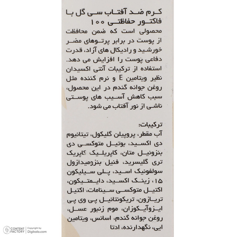 کرم ضدآفتاب سی گل با SPF 100 یک گزینه ایدهآل برای محافظت کامل از پوست در برابر اشعههای مضر خورشید است. این کرم، مناسب برای استفاده بر روی صورت، گردن و بدن، با ویژگیهای منحصر به فرد خود از پوست شما در برابر هر دو نوع اشعه UVA و UVB محافظت میکند. این محصول با فرمولاسیونی حاوی روغن جوانه گندم که خاصیت آنتیاکسیدانی دارد، به تغذیه و حفاظت از پوست کمک میکند و بافتی سبک و بدون رنگ دارد و این باعث میشود برای انواع پوست مناسب باشد. ماندگاری این کرم تا دو ساعت تضمین میکند که در طول روز، حتی در شرایط آفتابی و فعالیتهای بیرون از خانه، پوست شما همواره محافظت شده باقی میماند.