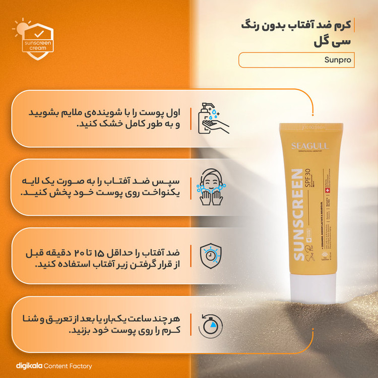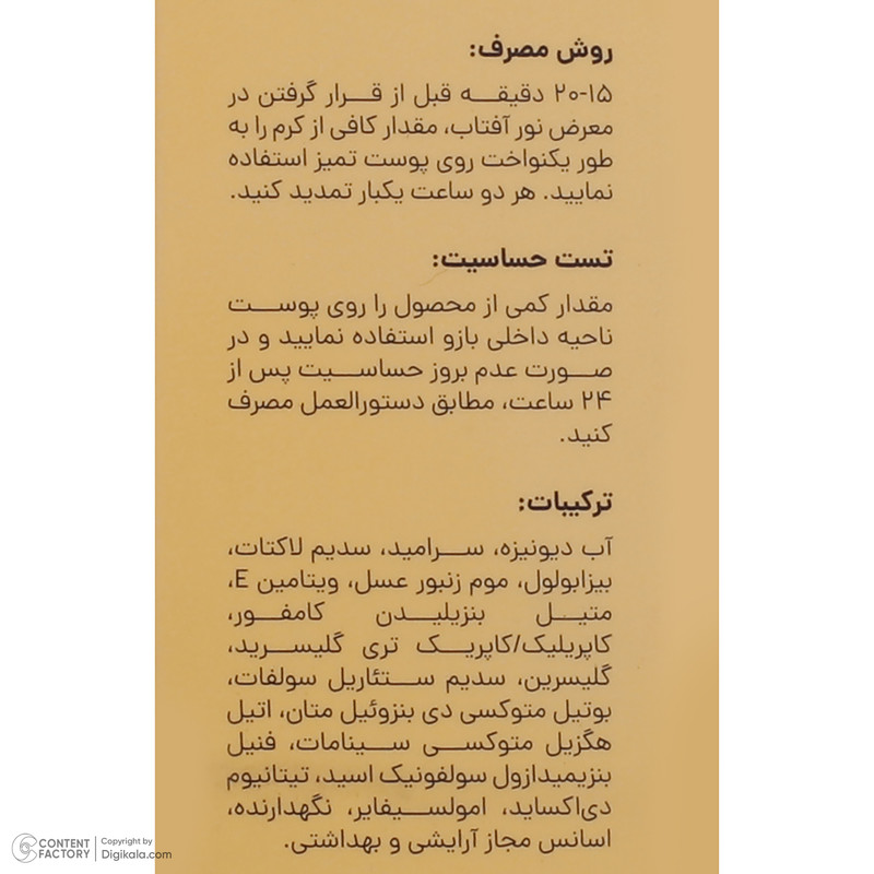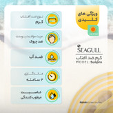 ویژگیهای ضدآفتاب : ضد آب , محافظت کننده در برابر اشعه UVA , محافظت کننده در برابر اشعه UVB , مرطوب کننده