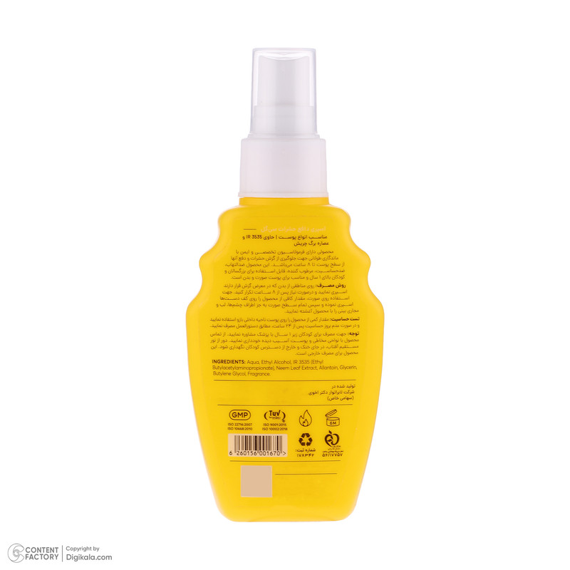 سایر مشخصات : اسپری دافع حشرات - مناسب برای صورت و بدن - دفع حشرات مانند پشه، مگس و انواع زنبور - ماندگاری به مدت ۸ ساعت - حاوی مواد موثر بر پایه اسید آمینه بتاآلامین - مناسب برای بزرگسالان و کودکان بالای ۱ سال