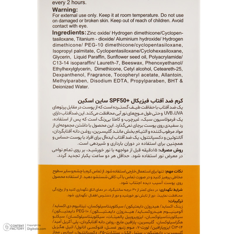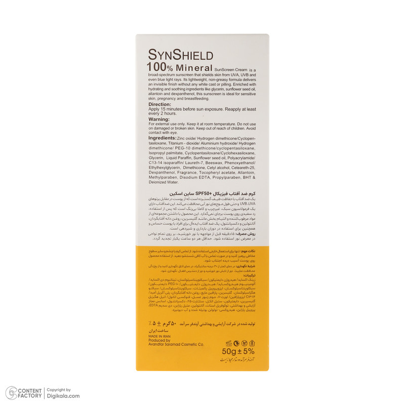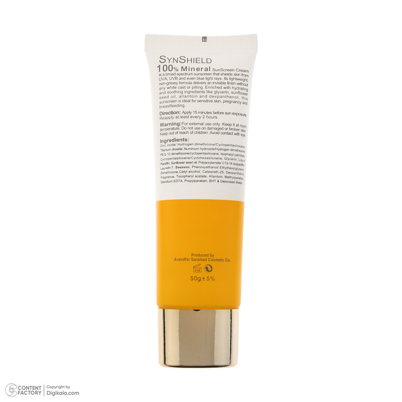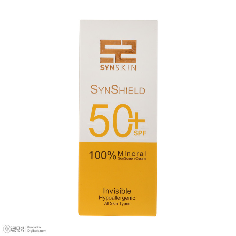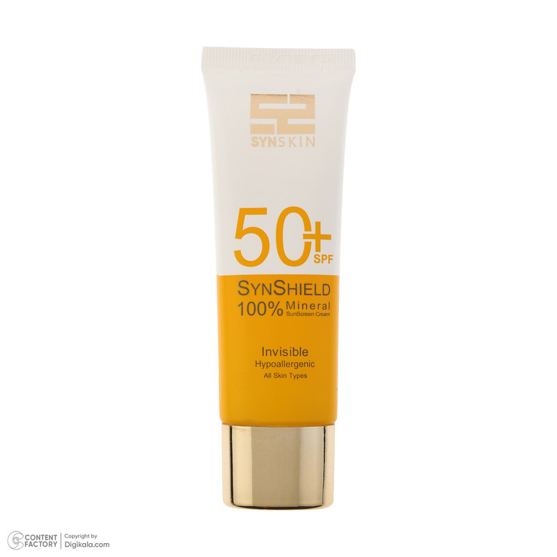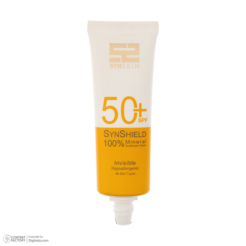 کرم ضد آفتاب بدون رنگ ساین اسکین SPF 50 مدل SYN Shield Mineral ‌محافظ UVA ،UVB، ضد حساسیت، مناسب انواع پوست‌ حجم 50 میلی‌لیتر