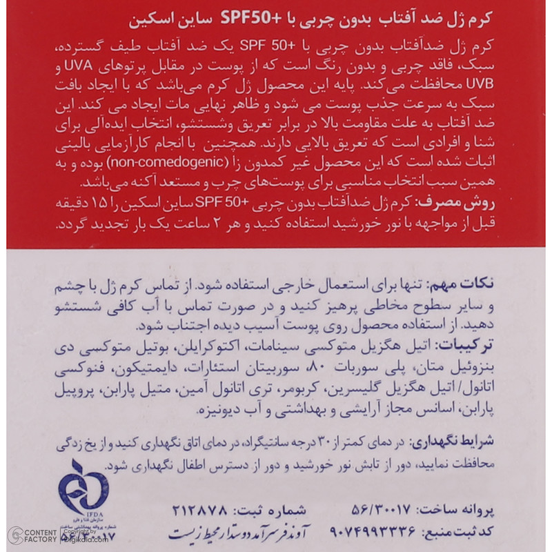 راهنمای استفاده : حداقل 15 دقیقه قبل از مواجهه با نور خورشید از کرم ژل ضدآفتاب استفاده گردد و علیرغم مقاومت این محصول در برابر شستشو و تعریق، با اینحال توصیه میشود هر دو ساعت یکبار تجدید شود.