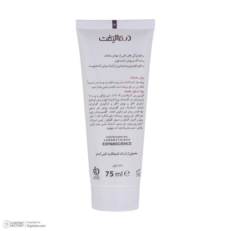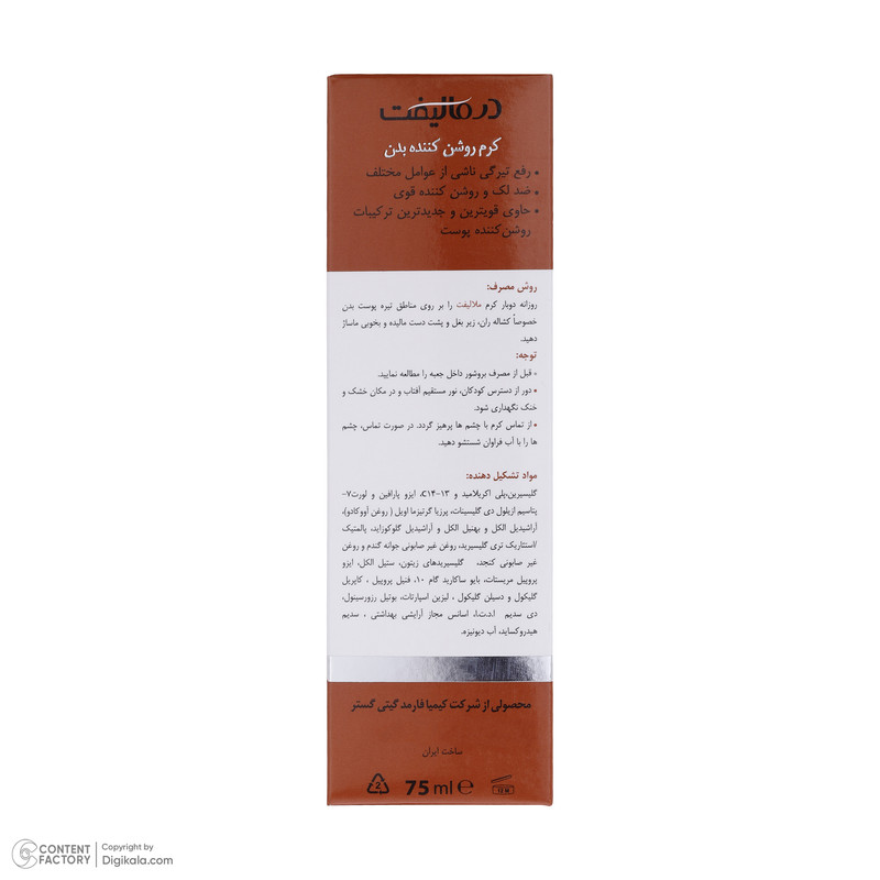 راهنمای استفاده: روزانه دو بار کرم ملالیفت را بر روی مناطق تیره پوست بدن خصوصا کشاله ران، زیر بغل و پشت دست مالیده و به خوبی ماساژ دهید.