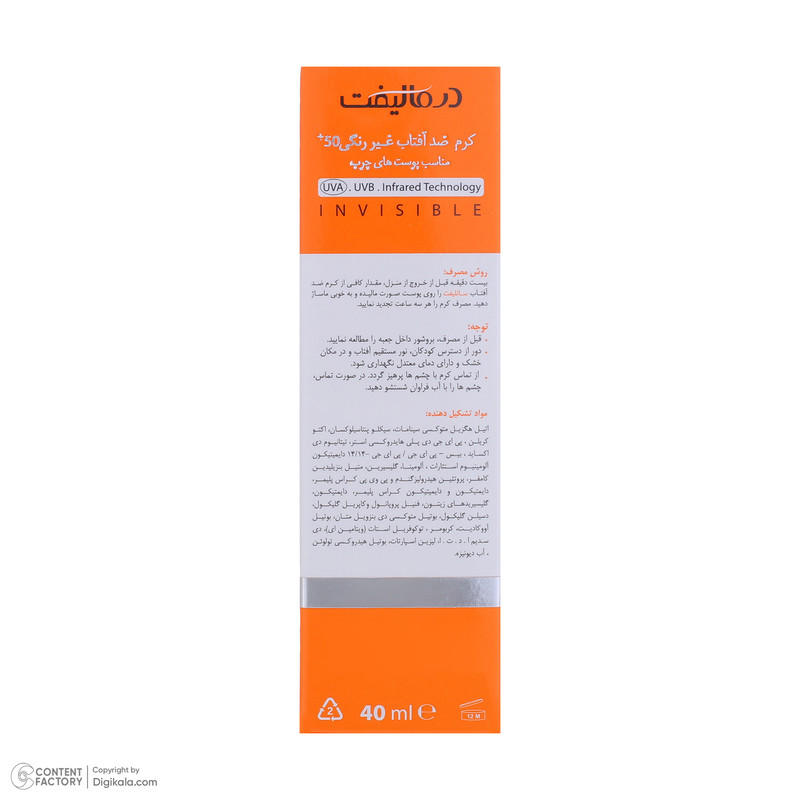 کرم ضدآفتاب بیرنگ درمالیفت با SPF 50 یک گزینه عالی برای افرادی است که به دنبال محافظت از پوست خود در برابر آفتاب بدون اثر رنگی روی پوست هستند. این کرم با حجم 40 میلیلیتر، مناسب برای استفاده بر روی صورت، گردن و بدن است و به ویژه برای پوستهای چرب طراحی شده است.