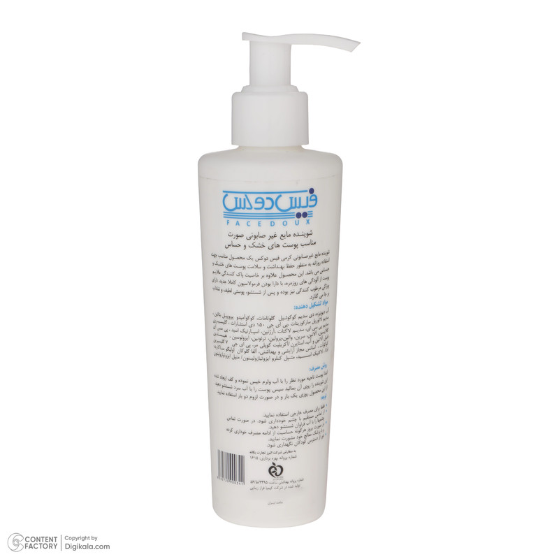 شوینده مایع غیر صابونی کرم دار فیس دوکس یک محصول مناسب برای روتین پوست صورت در استفاده روزانه به منظور بهداشت و پاکسازی پوست های خشک و حساس است. این محصول یک شوینده بسیار ملایم و قدرتمند در پاکسازی آلودگی های روزمره از سطح و منافذ پوست بوده و همزمان دارای خاصیت مرطوب کنندگی بوده و پس از استفاده پوست را لطیف تر و شاداب تر می نماید.