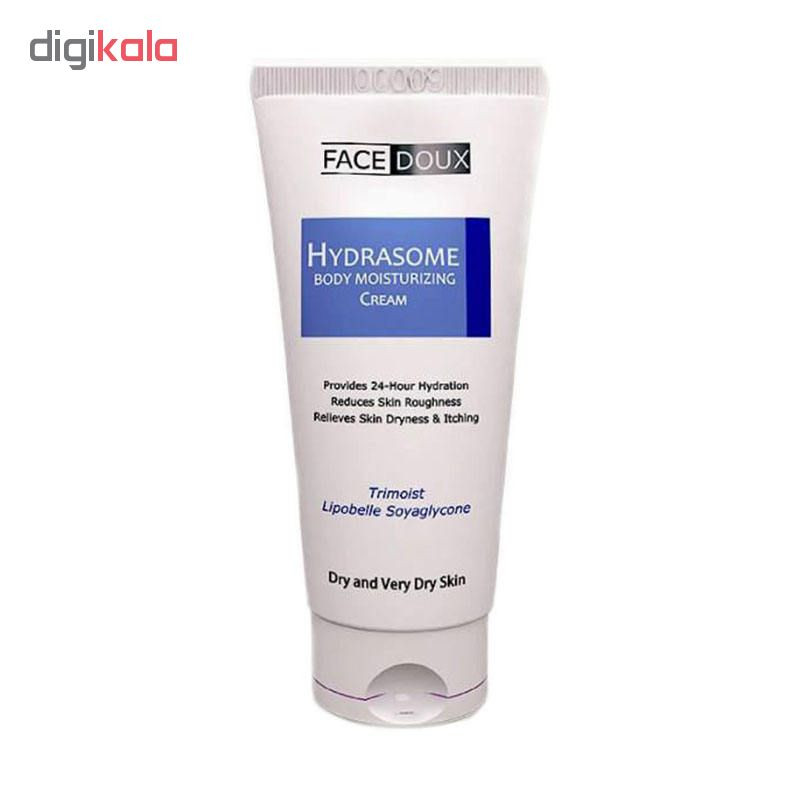 کرم مرطوب کننده بدن فیس دوکس با تشکیل یک لایه نازک لیپیدی منحصر به فرد توان پوست در جذب و نگهداری هر چه بیشتر رطوبت را بالا برده و توسط کمپلکس مرطوب کننده و آنتی اکسیدان به صورت ترکیبات انکپسوله لیپوزومال به لایه دفاعی پوست (استراتئوم کورنئوم) نفوذ کرده و موجب تقویت و احیاء فاکتورهای رطوبت دهنده طبیعی در پوست می گردد.این کرم مناسب پوست های خشک و حساس بوده و با مجموعه ای مواد موثره ی قوی به عنوان امولینت و مواد هموکتانت، پوست های خشک را نرم ، صاف و شاداب نگه می دارند. مجموعه کرم های هیدرازوم فیس دوکس همگی از ماده موثره فیتواستروژن مشتق از اسید آمینه جنیستئین به صورت لیپوزومال برای لیفت پوست، کاهش چین و چروک، افزایش ضخامت و استحکام پوست و همچنین ممانعت ازتخریب رشته های کلاژن و حفظ خاصیت کشسانی پوست، بهره گرفته اند. علاوه بر این، برای جلوگیری از پیر شدن پوست، کارنوزین موجود در این کرم که یک دی پپتید است با قند های کاهنده واکنش داده و مانع پدیده کلیدی گلیکاسیون (AEGs) واکنش غیر آنزیمی قند ها با پروتئین ها در پوست شده و مانع از تخریب رشته های کلاژن و الاستین می گردد.