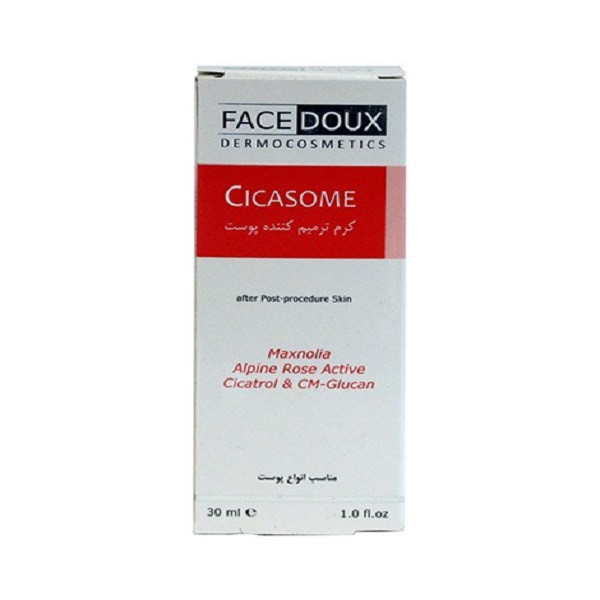 درباره محصول : کرم ترمیم کننده ای مناسب برای اسکار بر جای مانده از سوختگی، لیزر، پیلینگ و درم ابریژن ترمیم کننده cicasome، دارای فرمولاسیون اختصاصی جهت نفوذ بهتر به لایه های زیرین پوست حاوی سیکاترول، سلول های بنیادی با منشا گیاهی به منظور احیای سلول های پوست و افزایش سرعت بازسازی زخم سازگار با انواع پوست کرم ترمیم کننده فیس دوکس، در زخم های باز و جای بخیه قابل استفاده می باشد. ترمیم کننده قدرتمند در سوختگی های درجه 1 و 2 مناسب در بهبود جای گزش حشرات طریقه مصرف: روزانه دو بار روی محل مورد نظر که از پیش تمیز شده است، ماساژ دهید. کرم ترمیم کننده سیکازوم، در تیوپ های 30 میلی لیتری موجود می باشد.