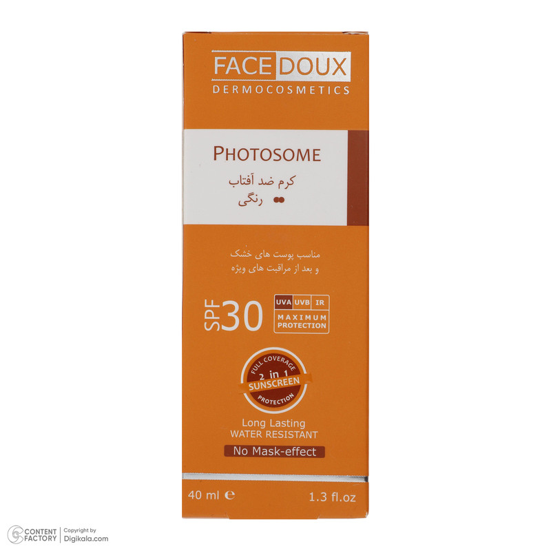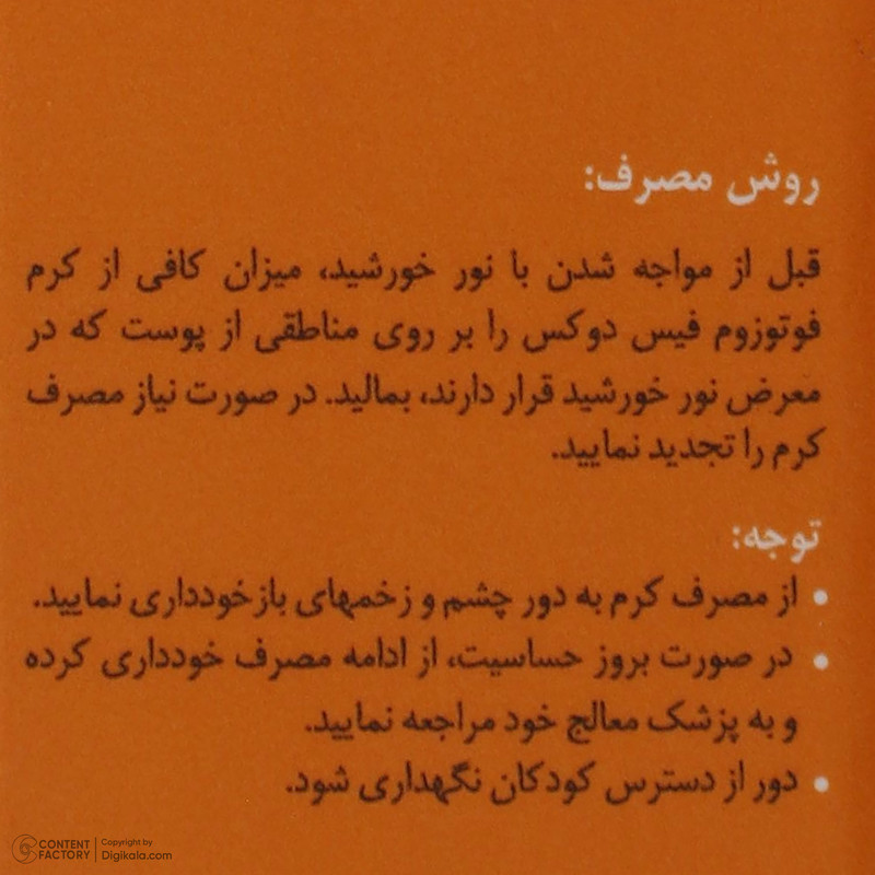 کرم ضد آفتاب فتوزوم مخصوص پوست خشک با خاصیت مرطوب کنندگی مناسب جهت محافظت در برابر نور ماوراءبنفش و همچنین خشکی پوست در هنگام در معرض نور خورشید بودن پوست به خوبی در پیشگیری از پیر پوستی ناشی از آفتاب عمل نموده و برای پوست های بعد از مراقبت های ویژه زیبایی مناسب است..این کرم مناسب افراد با پوست های خشک، حساس و معمولی بوده و نیاز یک پوست خشک و حساس به عوامل رطوبت رسان و مرطوب کننده و هر آنچه که برای آبرسانی و تغذیه ی پوست نیاز است تامین می کند. به همین دلیل بهترین محافظت از پوست را بعد از مراقبت های ویژه بر روی پوست همچون اعمال زیبایی و درمانی به عمل می آورد.این کرم با بکارگیری ترکیبی از انواع فیلترهای اشعه ماوراء بنفش با SPF30 تمامی طیف های این اشعه شامل UVA و UVB وهمچنین اشعه مادون قرمز (IR) را پوشش می دهد. میزان محافظت این کرم ماکزیمم مقدار ممکن می باشد.