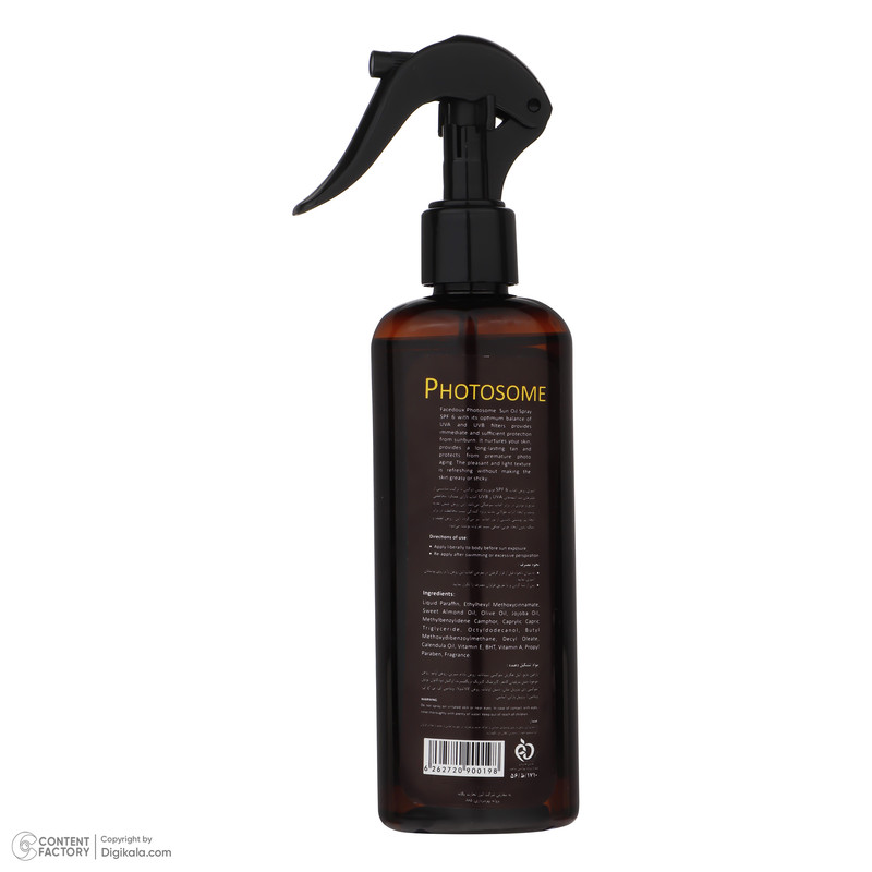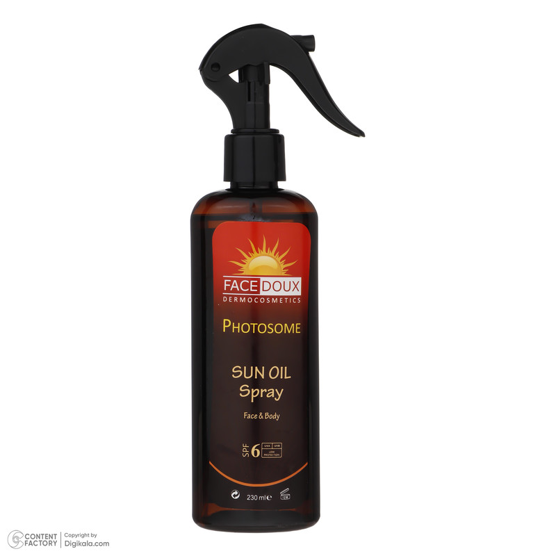 اسپری روغن آفتاب فوتوزوم فیس دوکس با ترکیب مناسبی از فیلترهای ضد اشعه های UVB و UVA آفتاب دارای عملکرد محافظتی سریع و موثر در برابر آفتاب سوختگی می باشد. این روغن ضمن تغذیه پوست و ایجاد اثرات طولانی مدت برنزه کنندگی سبب محافظت در برابر ایجاد پیر پوستی ناشی از نور آفتاب نیز می گردد. برای نتیجه گیری بیشتر جهت تمایل به برنزه نموده پوست توصیه می شود پس از حمام با پن اسکراب و بعد از خشک کردن پوست بر روی پوست اسپری گردد و خوب ماساژ دهید. این روغن لطیف، سبک و بدون ایجاد چربی اضافی بر روی پوست سبب طراوت پوست می شود. مناسب برای آقایان و بانوانی که با پیراهن آستین کوتاه در معرض نور خورشید قرار می گیرند و همچنین بسیار مناسب برای استفاده ورزشکاران است.