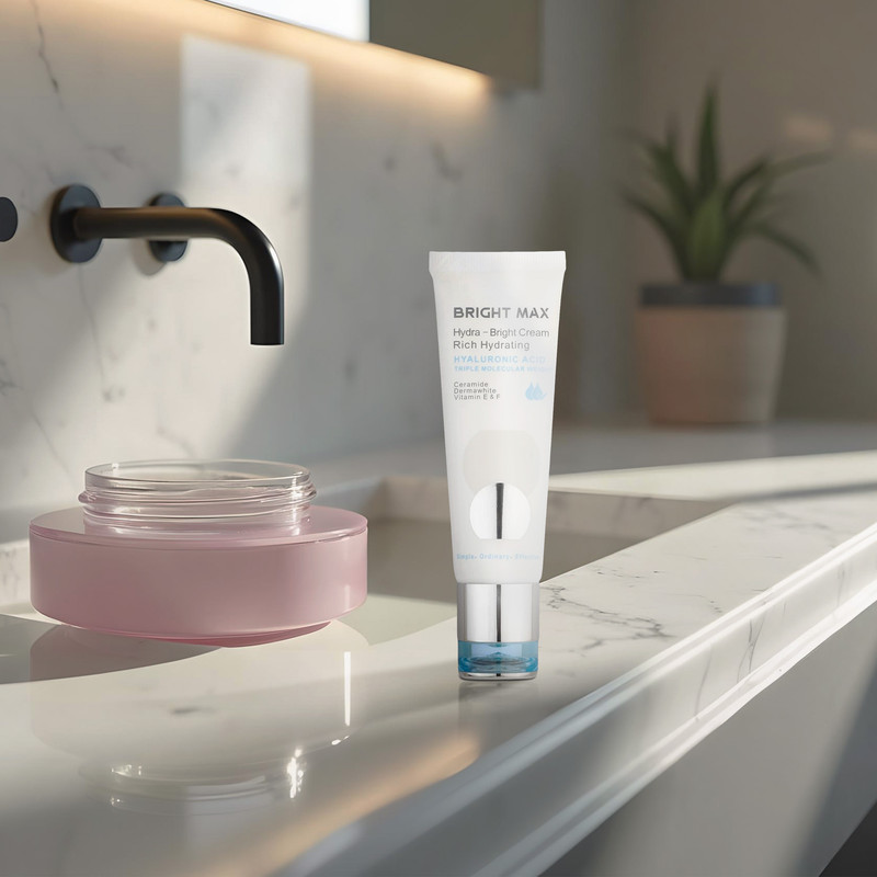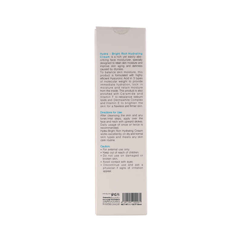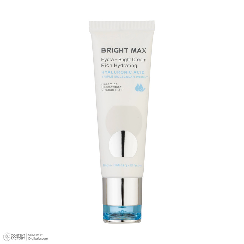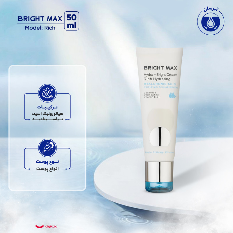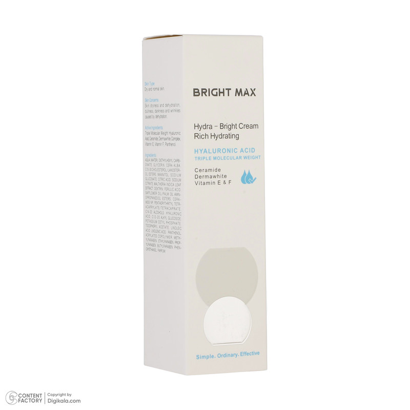 کرم آبرسان ریچ هیدرابرایت_برایت مکس مناسب پوست صورت خشک و نرمال است. و به جهت وجود هیالورونیک اسید با وزن مولکولی سه گانه باعث آبرسانی سریع پوست در لایه ی سطحی و عمقی می شود. علاوه بر این استفاده از پنتنول نیز خاصیت آبرسانی این کرم را تقویت می کند و مانع از تبخیر آب لایه های پوستی می گردد. سرامید، ویتامین F ، و ویتامین Eدر ترکیبات این محصول، منجر به تقویت سد دفاعی پوست و بهبود عملکرد حفاظتی پوست در مواجهه با آسیب های ناشی از رادیکال های آزاد و اشعه های مضر خورشید (پیری زود رس، خشکی، و التهاب پوست) می گردد. کمپلکس درماوایت با خاصیت روشن کنندگی و آنتی اکسیدانی حفظ و ارتقا سلامت پوست، جوانی و شادابی پوست را تضمین می کند.