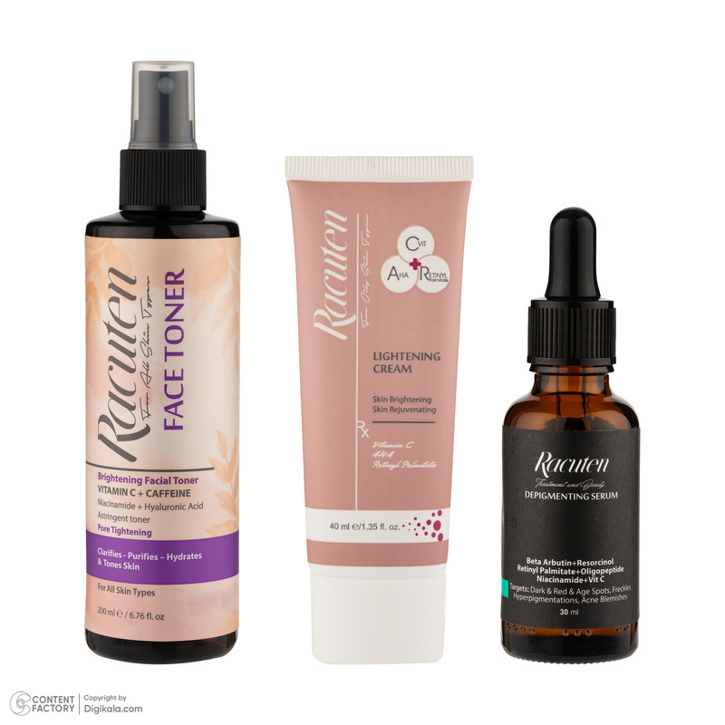 سایر توضیحات : تونر صورت حجم ۲۰۰ میلی لیتر، کرم روشن کننده حجم ۴۰ میلی لیتر و سرم روشن کننده حجم ۳۰ میلی لیتر حاوی ویتامین C و هیالورونیک اسید