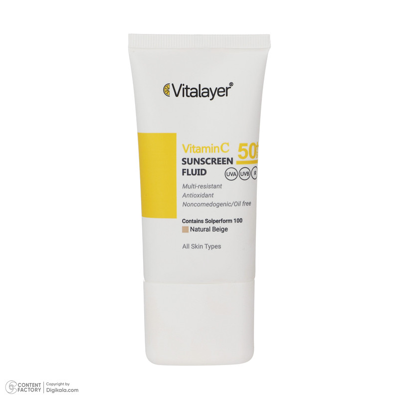 ضد آفتاب یک محصول مراقبت از پوست موضعی بسیار مهم برای پوست است. استفاده مرتب از ضد آفتاب میتواند خطر ابتلا به بیماریهای پوستی را کاهش دهد و از ایجاد انواع لک و چروک در پوست جلوگیری کند. فلوئید ضد آفتاب ویتالیر دارای ویتامین سی، یک محصول مناسب برای انواع پوست است. این کرم علاوه بر محافظت از پوست در برابر اشعه مضر آفتاب، میتواند لکهای موجود در سطح پوست را بهبود ببخشد و پوستی سالم و لطیف را برای شما به ارمغان بیاورد. این کرم دارای دو رنگ نچرال بژ، و کارامل بژ است.
