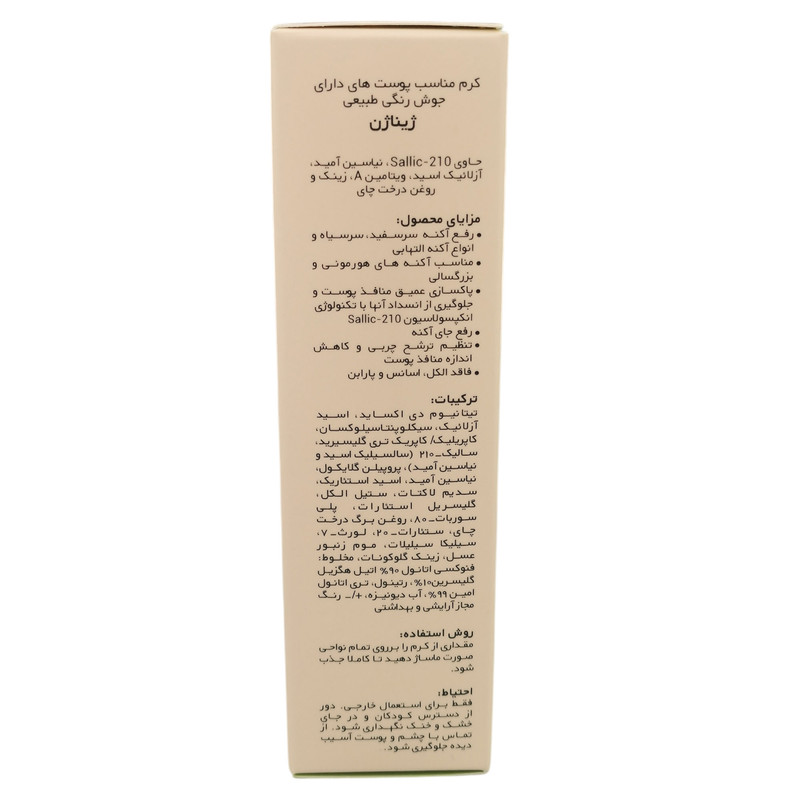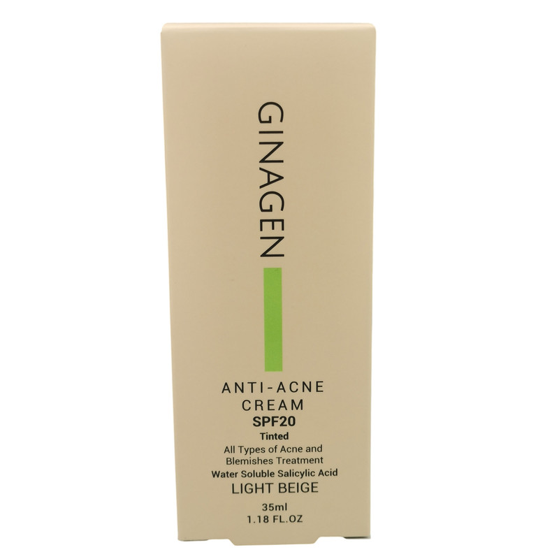 کرم ضد جوش رنگی ژیناژن دارای رنگ بژ طبیعی بوده و همچنین دارای SPF 20 است و برای همه نواحی پوست صورت قابل استفاده است. کرم ضد جوش بژ طبیعی Ginagen منافذ پوست را به صورت عمقی پاکسازی کرده و انسداد آن را برطرف می کند و با لایه برداری ملایم پوست، موجب حذف جوش و آکنه های سرسفید و سر سیاه می شود. همچنین، از بروز مجدد جوش و آکنه روی پوست نیز جلوگیری می کند. ضدجوش رنگی ژیناژن، سایز منافذ باز پوست را کوچک تر کرده و ترشح چربی پوست را کنترل می کند و پوست را نرم و مرطوب کرده و التهاب و قرمزی ناشی از آکنه را رفع می کند. کرم ضد جوش Natural Beige ژیناژن فاقد الکل، اسانس و پارابن بوده و حاوی ترکیبات ارزشمندی نظیر آزلائیک اسید، سالیسیلیک اسید، نیاسینامید، ویتامین A و زینک می باشد.