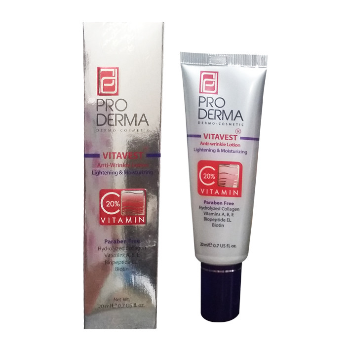 لوسیون ضد چروک پوست پرودرما حاوی 20% انواع ویتامین های C جهت تغذیه و افزایش شفافیت پوست می باشد.این لوسیون کمک شایانی به رفع چروک های سطحی و کاهش چروک های عمیق پوست و همچنین کمک به رفع سریع و موثر کدری و تیرگی پوست می کند.