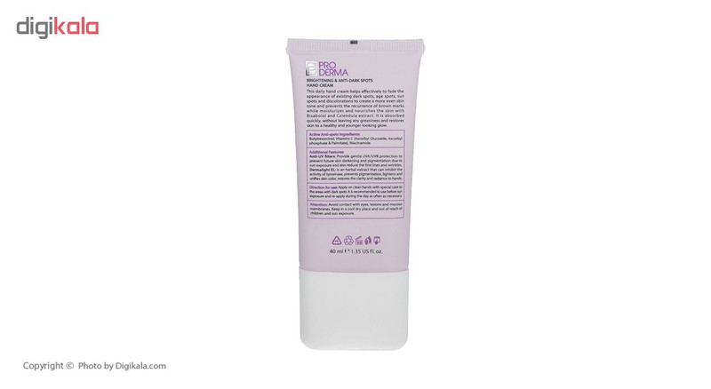 شرکت آراشیمی پارس با هدف تولید محصولات بهداشتی و آرایشی و به منظور ارتقا و بهبود سلامت پوست و مو و پاسخگویی به نیازهای بهداشتی اقشار مختلف جامعه راه اندازی شده است. هم اکنون محصولات شرکت آراشیمی پارس با نام تجاری پرودرما که شامل انواع کرم های ضدآفتاب، مرطوب کننده، محصولات ضدجوش، انواع پن های درماتولوژیک، محصولات لایه بردار، کرم های ضدچروک، سفت کننده پوست و غیره میباشد با استفاده از مواد اولیه این شرکت فرموله و تولید میشود و درج لوگوی Formulated with usage of Silab actives بر روی بسته بندی این محصولات نشان دهنده مجوز همکاری با این شرکت معتبر فرانسوی است. این کرم روشن کننده و ضد لک پوست دست مناسب برای پوست دست است که کمک به رفع موثر لک های تیره و قهوه ای پوست دست ناشی از افزایش سن و تابش نور خورشید میشود. مرطوب کننده، تقویت کننده، افزایش نرمی و لطافت پوست دست از خصوصیات این کرم است. دارای فلیترهای جاذب تابش فرابنفش و پیشگیری از بروز لک های حاصل از نور خورشید که کمک به کاهش چین و چروک های سطحی پوست و افزایش شفافیت و ایجاد پوستی صاف و یکنواخت میشود.جذب سریع پوستی بدون برجای گذاشتن اثر چربی روی پوست میشود.بوتیل رزورسینول، با توانایی بالا در مهار آنزیم تیروزیناز و کاهش سنتز ملانین در پوست، سبب جلوگیری از بروز و همچنین کاهش سایز و اندازه لک های قهوه ای و تیره پوستی میشود Dermalight EL عصاره گیاهی است که با جلوگیری از تولید بیش از حد رنگدانه های پوستی سبب افزایش شفافیت و یکنواختی رنگ پوست دست میشود. روش مصرف در طول روز و مخصوصا قبل از قرار گرفتن در معرض تابش نور خورشید، مقدار کافی از کرم را بر روی پوست کاملاً تمیز دست ها و بویژه بر روی قسمت های دارای لک های تیره مالیده و به آرامی ماساژ دهید تا کاملاً جذب گردد. مصرف را در طول روز تجدید فرمایید.