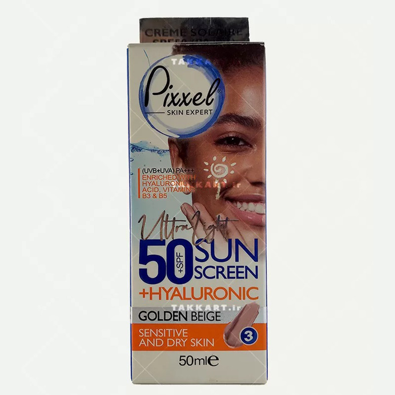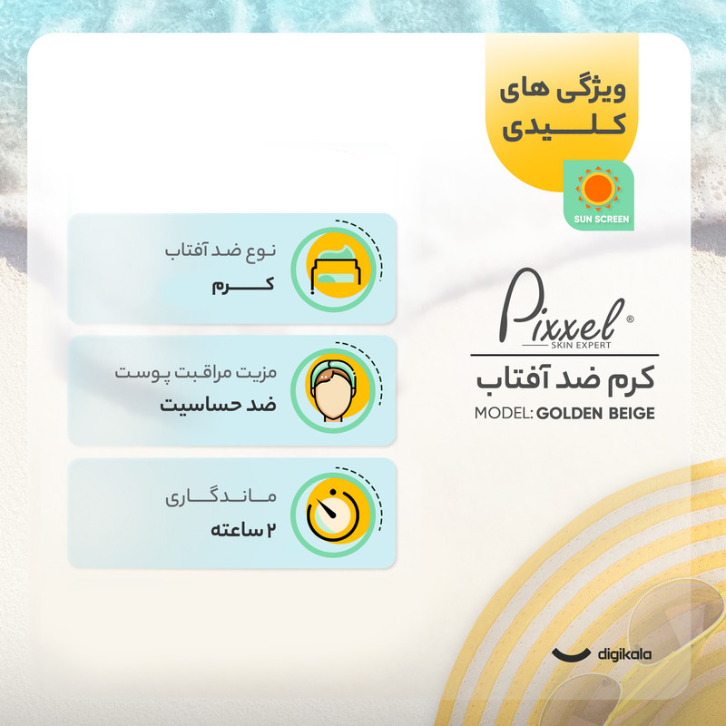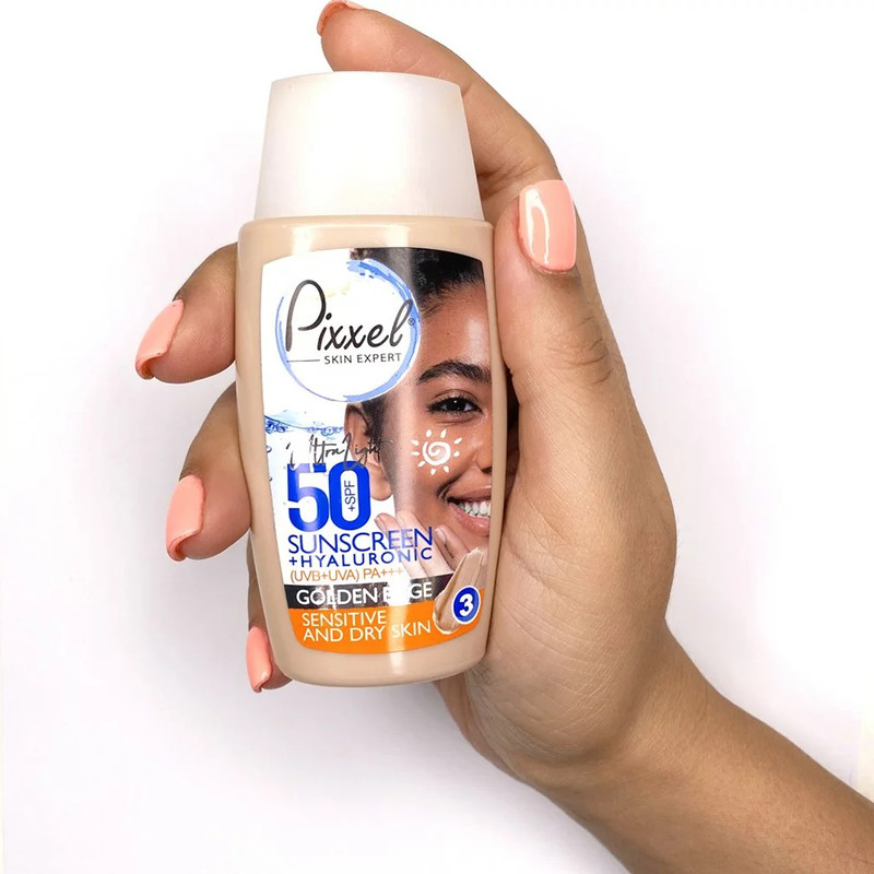 کرم ضد آفتاب رنگی پیکسل، 50 SPF، مدل GOLDEN BEIGE، مناسب پوست نرمال، خشک و حساس تنالیته رنگ تیره و حجم 50 میلیلیتر، محافظت کننده در برابر اشعه UVA و UVB، ضد حساسیت، +++ PA، آبرسان، با ماندگاری 2 ساعته