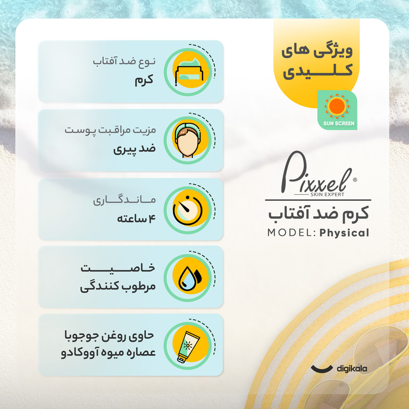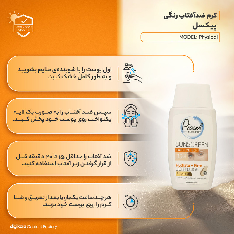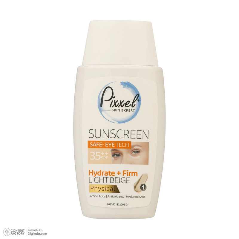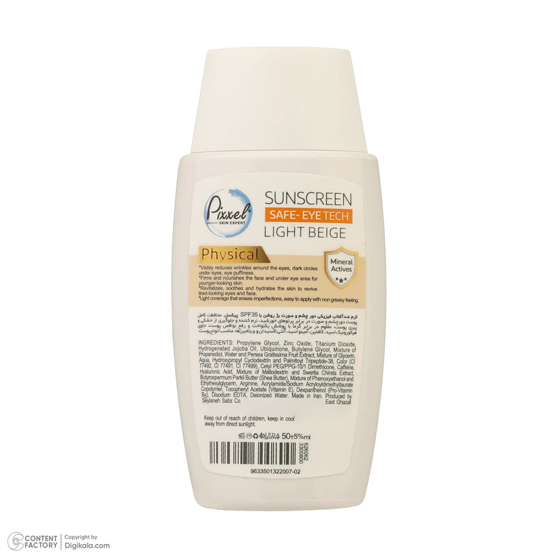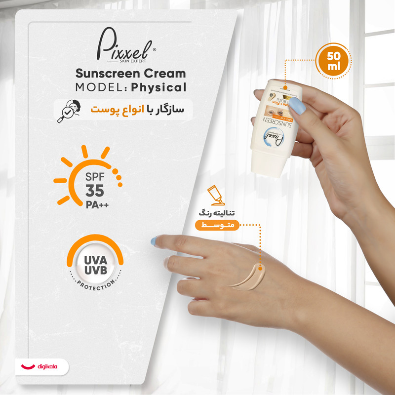 کرم ضدآفتاب رنگی دور چشم و صورت پیکسل SPF35 مدل Physical، حاوی محافظ UVA ،++PA و UVB، ضد پیری، مرطوب‌کننده، مناسب انواع پوست حجم 50 میلی‌لیتر