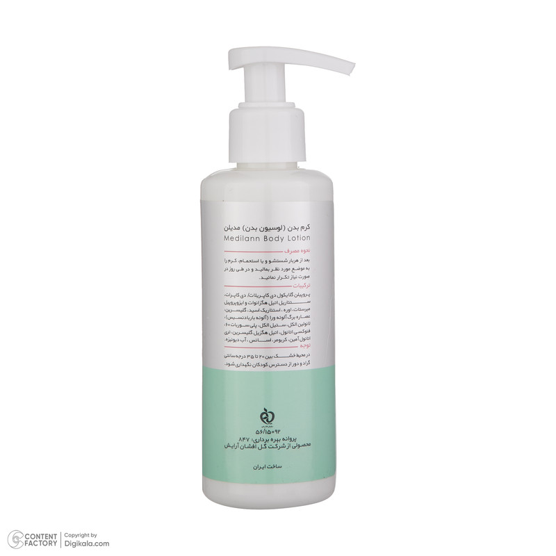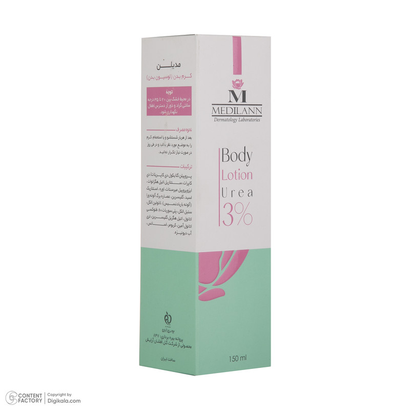 لوسیون بدن Medilann، محافظ پوست در برابر خشکی و دهیدراته شدن است و خاصیت ضد چروک دارد. لوسیون بدن سه درصد اوره مدیلن، از خشکی پوست پس از شستشوی بدن جلوگیری میکند، باعث رطوبت رسانی عمقی به پوست میشود، از خارش، زبر شدن و پوسته پوسته شدن پیشگیری میکند، مانع از ایجاد چین و چروک و افتادگی پوست میشود، علائم اگزما و پسوریازیس را کاهش میدهد و از پوست در برابر رادیکالهای آزاد مراقبت میکند. کوآنزیم 10Q موجود در لوسیون بدن مدیلن بعنوان عامل ضد چروک و ضد رادیکال های آزاد عمل می نماید و مانع از افتادگی پوست بدن می شود. اوره موجود در لوسیون بدن مدیلن Urea3%، خاصیت حفظ رطوبت پوست را دارا می باشد و باعث نرمی و لطافت پوست می شود. عصاره آلوئه ورا موجود در این لوسیون بدن یک مرطوب کننده قوی گیاهی و ضد التهاب محسوب می شود.