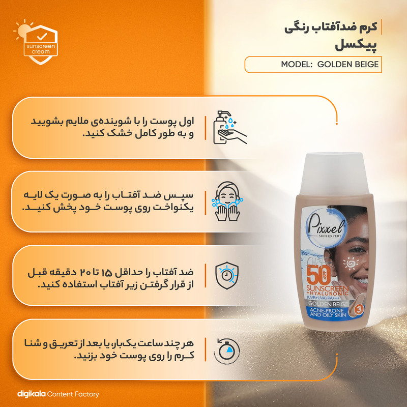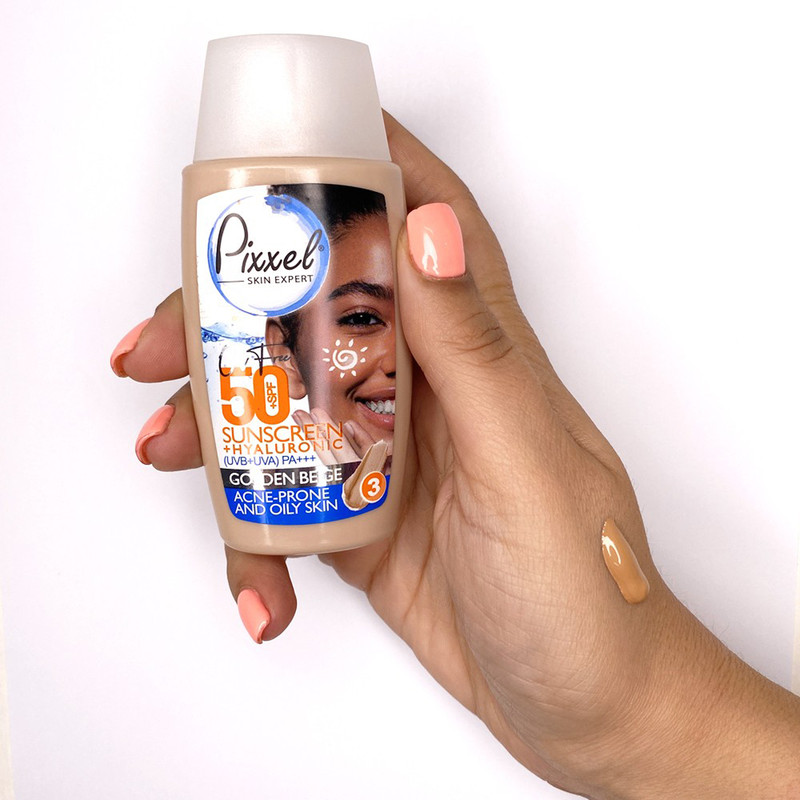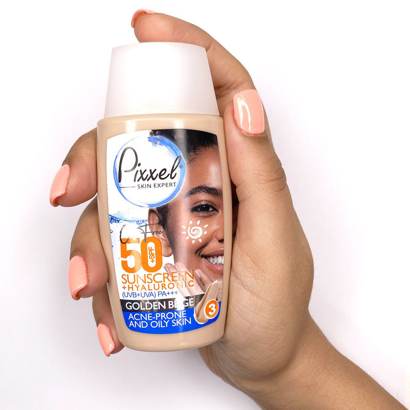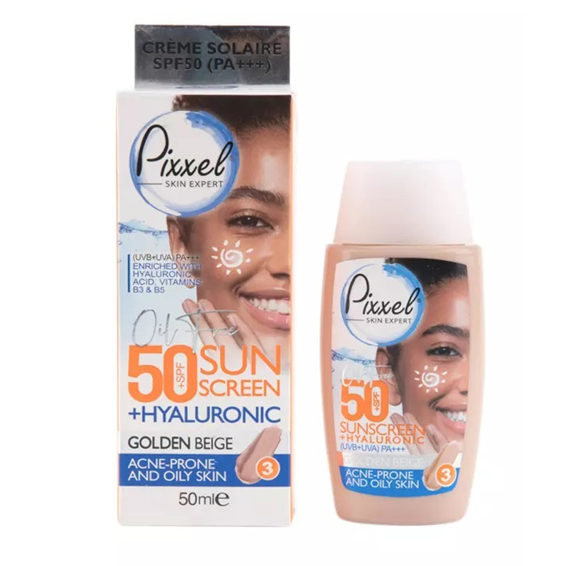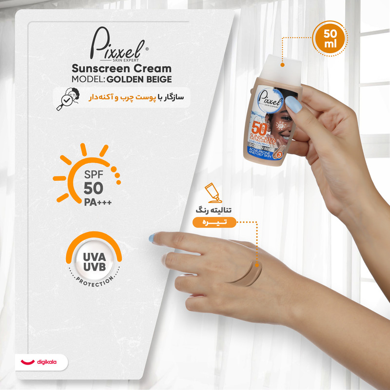 کرم ضد آفتاب رنگی پیکسل، SPF 50، مدل GOLDEN BEIGE، مناسب پوست‌های آکنه‌دار و چرب با تنالیته تیره و حجم 50 میلی‌لیتر، محافظت‌کننده در برابر اشعه‌های UVA و PA ،UVB+++، ضد جوش و آکنه، دارای فرمولاسیون فاقد چربی و هیالورونیک اسید، با ماندگاری 2 ساعته