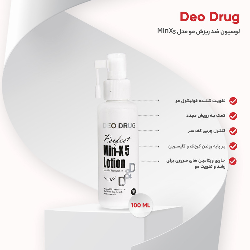 لوسیون تقویت کننده مو دئودراگ مدل MinX5 سرشار از عصارههای گیاهی و روغنها بوده و به رویش مجدد مو کمک میکند. با استفاده از این محصول میتوان از ریزش مو نیز جلوگیری نمود. لوسیون دئودراگ فولیکولهای مو را تقویت کرده و چربی کف سر را نیز کنترل میکند. کنترل چربی سر باعث میشود تا چربی بیش از اندازه مو سبب ریزش موها نشود. از طرفی انواع ویتامینهای ضروری برای رشد و تقویت مو از قبیل ویتامین A، ویتامین C، توکوفرول و دکسپانتنول لحاظ شدهاند، در کنار ویتامینها، سوپرآنتی اکسیدانهایی قرار گرفتهاند که در مهار فاز تلوژن و افزایش فاز رشد مو در چرخه رشد مو تاثیر دارند، که شامل آستاگزانتین، کاروتنوئیدهای گیاهی و کوئرستین (فلاونوئید گیاهی) به همراه عصاره چای سبز (کاتچین) است. متأسفانه در محصولات مهارکننده ریزش مو از پروپیلن گلیکول به عنوان پایه محصول استفاده میشود که باعث ایجاد التهاب و چرب شدن پوست سر مصرفکننده میگردد اما خوشبختانه در این محصول از روغن کرچک و گلیسرین به عنوان پایه استفاده شده است که مشکلات ذکر شده را ندارد. در نهایت باید گفت این محصول در کنار درمانهای سیستمیک و موضعی به عنوان خط اول درمان قرار میگیرد.