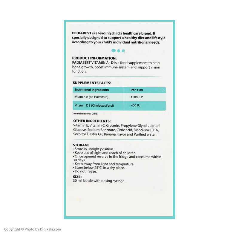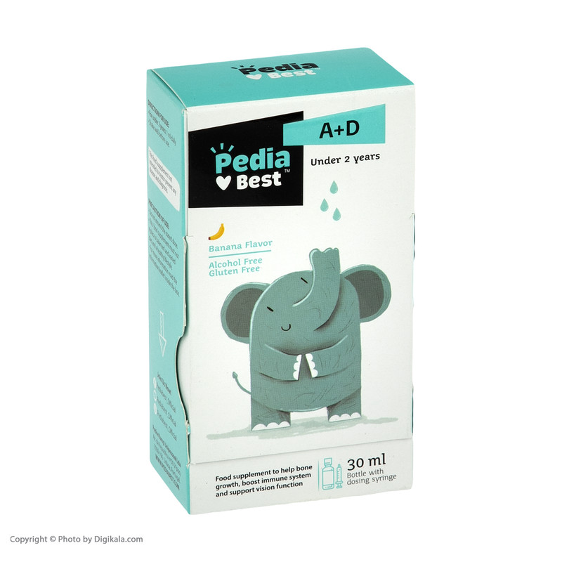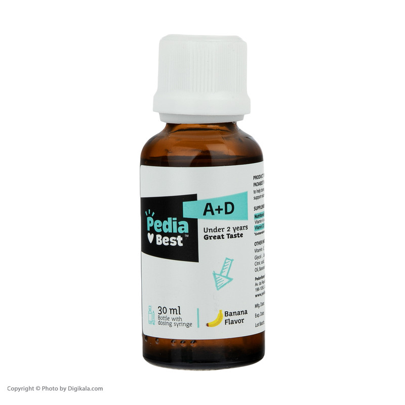 درباره محصول : قطره آد پدیابست مکمل غذایی کمککننده به تقویت و رشد کودکان کمک به حفظ سلامت استخوانها کمک به تقویت سیستم ایمنی بدن مفید در حفظ سلامت سیستم بینایی قطره آ د پدیابست مناسب جهت مصرف توسط کودکان زیر 2 سال با طعم موزی به همراه سرنگ مدرج جهت تسهیل در اندازهگیری قطره ویتامین آ د پدیابست فاقد گلوتن و فاقد الکل میباشد. ویتامین آ د پدیابست در حجم 30 میلیلیتر تولید شده است.