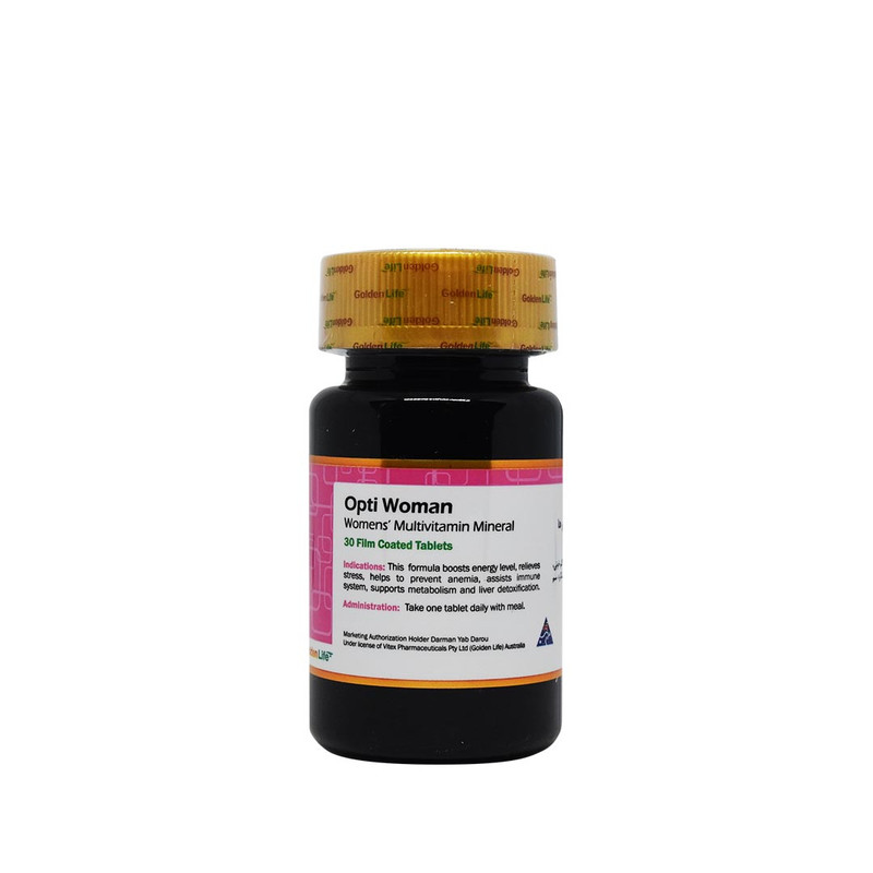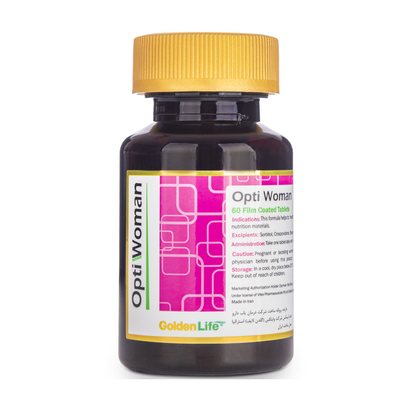 درباره محصول : مولتی ویتامین اپتی وومن حاوی ویتامین ها و عناصر ضروری مورد نیاز خانم ها مولتی ویتامین مینرال اپتی وومن تحت لیسانس گلدن لایف استرالیا موثر در بهبود متابولیسم، افزایش انرژی و رفع خستگی با دارا بودن ویتامین های گروه ب و گیاه جینسنگ (Ginseng) آنتی اکسیدان و موثر در ارتقای سلامت عمومی بدن بانوان با دارا بودن زینک، بتاکاروتن، ویتامین های سی و ای موثر در حفظ سلامت پوست، مو و ناخن به واسطه ی حضور ویتامین های گروه B، E، C، سیلیکا و کاروتنوئید تقویت سیستم ایمنی به علت دارا بودن زینک، مس و ویتامین های ث، ای و ب6 و جین سنگ کمک به پیشگیری و درمان کم خونی به علت دارا بودن آهن (فروس فومارات)، اسید فولیک، ویتامین B12 کمک به پاکسازی و سم زدایی کبدی به علت وجود عصاره خارمریم (Milk Thistle) در هر قرص در صورتی که قصد بارداری دارید، می توانید از این محصول استفاده کنید. زنان باردار و شیرده حتماً قبل از مصرف با پزشک خود مشورت کنند. هر قوطی از این محصول مناسب برای استفاده ی 60 روزه است.