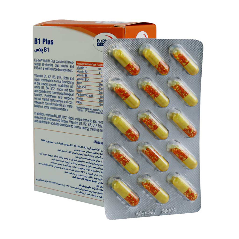 کپسول ب1 پلاس یوروویتال یک ترکیب متعادل از ویتامین B1 به همراه سایر ویتامین های گروه B می باشد که برای کمک به عملکرد نرمال سیستم عصبی طراحی شده است. کپسول B1 پلاس علاوه بر 8 ویتامین ضروری خانواده ب کمپلکس از جمله B1، B2، B6، B12، بیوتین، نیاسین، فولیک اسید و پانتوتنیک اسید، حاوی 2 ترکیب شبه ویتامین به نام های اینوزیتول و پارا آمینو بنزوئیک اسید (PABA) نیز می باشد. ویتامین های خانواده B برای پیشبرد اغلب متابولیسم های انرژی زا در بدن ضروری می باشند. از همین رو ب1 پلاس می تواند احساس ضعف و خستگی ناشی از کمبود ویتامین را برطرف نماید. ویتامین های B1، B2، B6، B12، بیوتین و نیاسین برای سنتز میلین نورون های عصبی، تولید و متابولیسم ناقل های عصبی و عملکرد نرمال سیستم اعصاب مرکزی و محیطی ضروری می باشند. ویتامین های B1، B6، B12، نیاسین و فولیک اسید برای حفظ سلامت روان حیاتی می باشند و پانتوتنیک اسید عملکرد ذهنی را تقویت می کند.