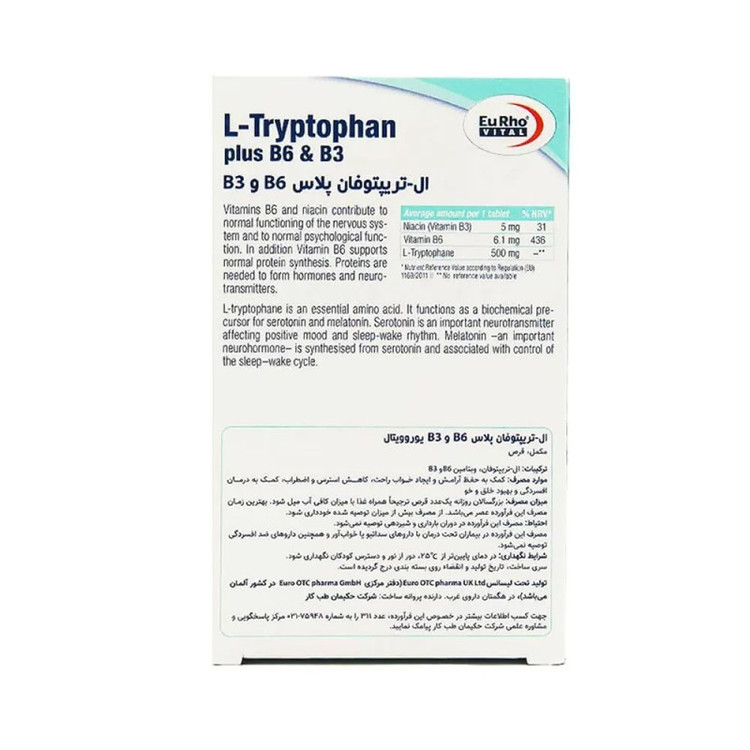 قرص ال تریپتوفان پلاس B6 و B3 یوروویتال بسته 60 عددی