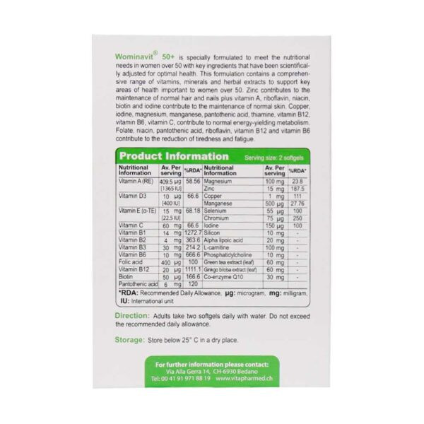 کپسول نرم ومیناویت بالای 50 سال ویوا تیون حاوی مواد مغذی و ویتامینهای موردنیاز جهت حفظ سلامتی خانمهای 50 سال به بالا است. تغذیه مناسب در دوران سالمندی برای حفظ توانایی ذهنی و جسمی و حفظ توانمندی بدن برای مقابله با بیماریهای مختلف ضرورت دارد اما دریافت روزانه مکملها ضامن سلامت طولانیمدت است. در واقع مکملهای غذایی میتوانند جایگزین مناسبی برای کمبودهای تغذیهای افراد باشند. کپسول نرم ومیناویت بالای 50 سال ویوا تیون یکی از مکملهای مناسب این دوران است که بر اساس نیاز بدن خانمها فرموله شده است. خانمها با بالا رفتن سن و شروع دوران مونوپوز، به دلیل کاهش هورمون استروژن مشکلاتی چون گرگرفتگی، اضطراب، بیخوابی، تعریق شبانه، افسردگی، کاهش تمایلات ، اضافه وزن، بیماریهای قلبی – عروقی، پرفشاری خون و پوکی استخوان برایشان به وجود میآید. با اقدامات مناسب و تامین نیاز بدن به انواع ویتامین و املاح معدنی میتوان تا حدی بروز اینگونه بیماریها را به تعویق انداخت و یا آنها را درمان کرد.
