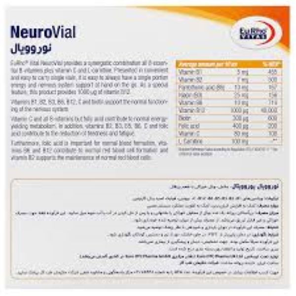 نوروویال، ویال خوراکی حاوی دوز بالای ویتامین B12 (۱۰۰۰ میکروگرم در هر ویال) به همراه مجموعه کامل ویتامینهای گروه B، ویتامین C و ال-کارنیتین است که برای کمک به رفع کمبودهای تغذیهای و حمایت از عملکرد سیستم عصبی و متابولیسم انرژی طراحی شده است.