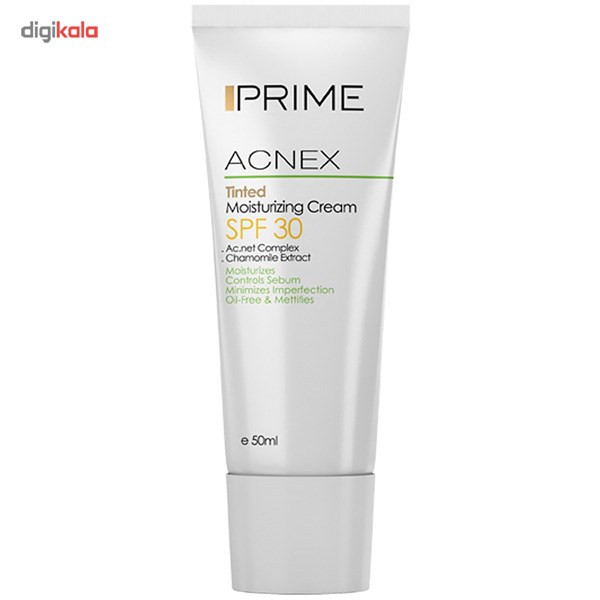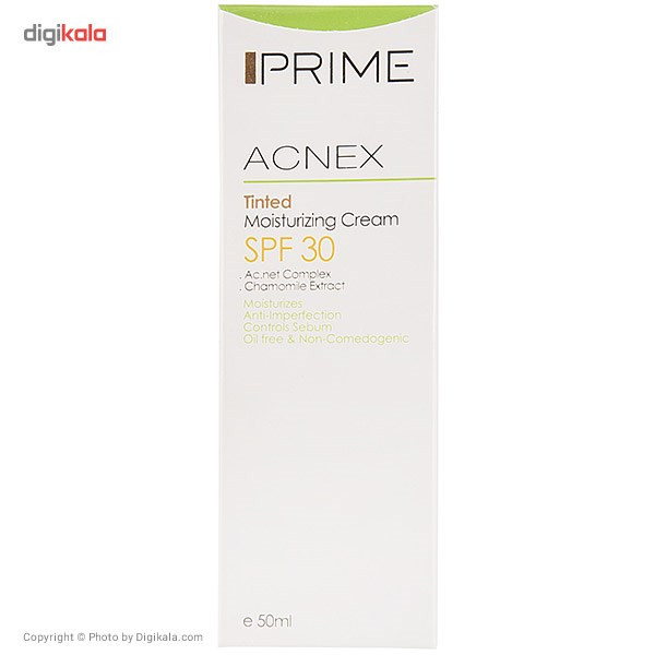کرم مرطوبکننده برند «پریم» (Prime) مدل (Acnex Tinted) حجمی معادل 50 میلیلیتر دارد که از نوع رنگی است. مرطوبکنندهی پریم با SPF30 میتواند نقش یک ضدآفتاب را هم داشته باشد؛ هرچند میزان SPF بالا نیست اما بازهم از برخورد اشعههای مضر نور خورشید پوست را محفوظ نگهمیدارد. این کرم مرطوب هم بهعنوان یک ضدآفتاب و هم بهعنوان یک کرمپودر قابل استفاده است. پریم آبرسانی به پوست را برعهده دارد و رطوبت موردنیاز پوست را هم حفظ میکند و خشک شدن پوست جلوگیری میکند. مرطوبکنندهی پریم فاقد چربی است و برای افرادی که پوستهایی چرب و بسیار چرب دارند مناسب است. پریم ضدجوش و آکنه است و توانایی کنترل سبوم پوست را دارد. استفاده از پریم نقصها و عیوب صورتتان را میپوشاند و جلوهای زیبا، خوشرنگ و بدون نقص به پوست شما میبخشد. پریم علاوهبر مرطوبکنندگی خاصیت نرمکنندگی پوست را هم دارد و استفاده از کرم پریم نرمی و لطافت پوست را هم بهدنبال دارد. محفظهی نگهدارندهی کرم مرطوبکننده و نرمکنندهی پریم تیوپی و از جنس پلاستیک است که استفادهی بسیار آسانی دارد.