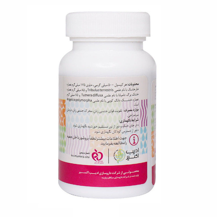 سایر توضیحات: هر کپسول حاوی 175 میلی گرم عصاره خارخاسک و 85 میلی گرم عصاره خشک برگ دامیانا و 85 میلی گرم عصاره خشک دانگ کویی