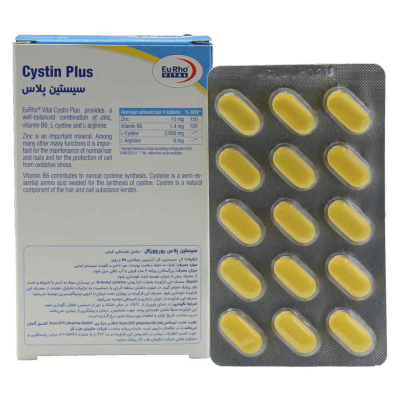 قرص سیستین پلاس یوروویتال حاوی 2000 میلیگرم آمینو اسید ال- سیستئین در کنار آمینو اسید ال- آرژینین، زینک و ویتامین B6 است که با جلوگیری از ریزش مو و شکنندگی ناخنها، به رشد مناسب مو و تقویت ناخنها کمک میکند.