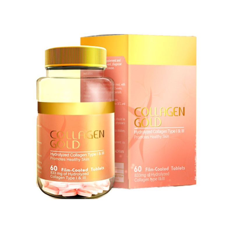 درباره محصول : کلاژن گلد، مکمل تقویت پوست، مو و ناخن حاوی دوز مناسبی از پپتیدهای کلاژن هیدرولیز شده نوع 1 و 3 کلاژن گلد، با جذب بهتر و آسان تر به علت هیدرولیز بودن پپتیدهای کلاژن قرص کلاژن گلد، موثر در بهبود کیفیت کلی پوست و به تعویق انداختن روند پیری پوست collagen gold، کمک به کاهش ایجاد چین و چروک و حفظ استحکام پوست دارای احتمال کمتری از عارضه گوارشی به علت داشتن فرم قرص روکش دار