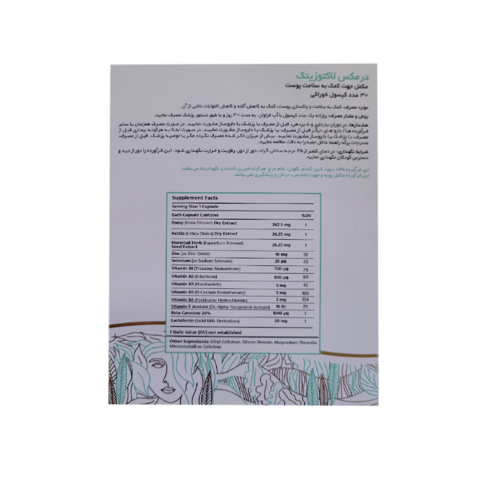 درباره محصول : لاکتوزینک، مکمل غذایی ضد جوش و آکنه برای کمک به پاکسازی و حفظ سلامت پوست دارای مواد موثره با خواص ضد میکروبی علیه باکتریهای مولد آکنه دارای اثرات ضد التهابی بواسطه ترکیباتی نظیر لاکتوفرین و عصارههای گیاهی کمک به ساخت کلاژن و ترمیم پوست، به دلیل حضور عصاره گیاه دم اسب قرص لاکتوزینک درمکس، دارای اثرات مطلوب برکنترل ترشح سبوم و تنظیم چربی پوست بهبود دهنده وضعیت آنتی اکسیدانی پوست به واسطه ترکیباتی نظیر زینک، سلنیوم و بتاکاروتن فاقد سویا، شیر، گندم، گلوتن، تخم مرغ، هرگونه شیرین کننده و نگهدارنده