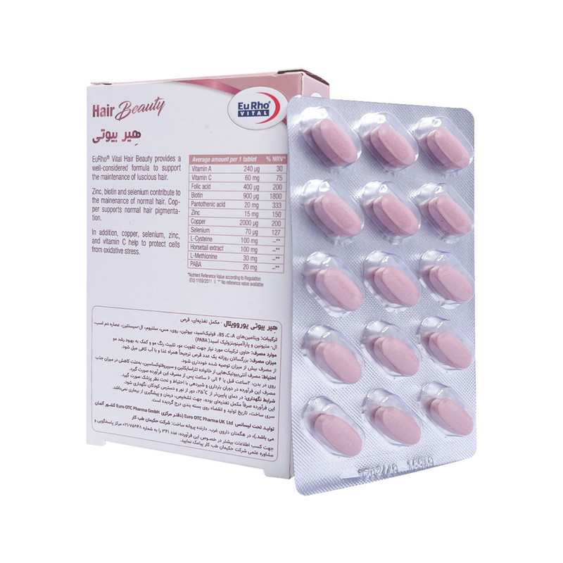 درباره محصول : قرص هیر بیوتی، کمک به تقویت فولیکولهای مو با ۹۰۰ میکروگرم بیوتین و ۱۵ میلیگرم زینک برای کاهش نازک شدن و ریزش مو رشد مجدد و پرپشت شدن موها با ۱۰۰ میلیگرم ال-سیستئین و ۳۰ میلیگرم ال-متیونین به عنوان بلوکهای ساختمانی کراتین کمک به تثبیت رنگ مو و جلوگیری از سفید شدن زودرس با ۲۰ میلیگرم PABA و ۲۰۰۰ میکروگرم مس برای حمایت از تولید ملانین قرص هیر بیوتی، تقویت و جلوگیری از شکنندگی ناخنها با ۷۰ میکروگرم سلنیوم و ۲۰ میلیگرم ویتامین B5 برای افزایش استحکام و درخشندگی بهبود متابولیسم سلولی مو با ۴۰۰ میکروگرم فولیک اسید و ۶۰ میلیگرم ویتامین C برای اکسیژنرسانی بهتر به ریشه مو نقش در محافظت آنتیاکسیدانی از مو با عصاره دم اسب (۱۰۰ میلیگرم) و ویتامین A (۲۴۰ میکروگرم) برای جلوگیری از آسیب اکسیداتیو افزایش جریان خون به پوست سر و تحریک رشد مو با ترکیب اسیدهای آمینه و مواد معدنی برای نتایج سریعتر هیر بیوتی با فرمولاسیون گیاهی و متعادل برای حمایت جامع از سلامت مو، ناخن و پوست بدون عوارض گوارشی