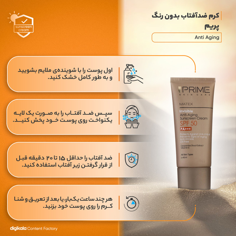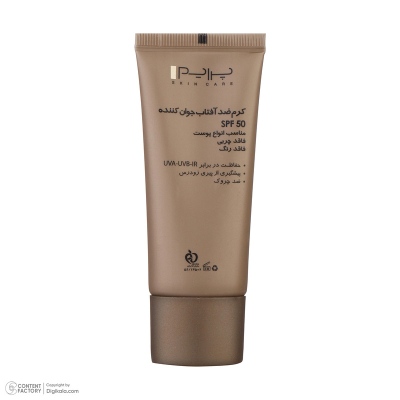کرم ضدآفتاب پرایم با SPF 50 و PA+++، محصولی بینظیر از ایران، با ترکیبی خاص و بدون رنگ که به طور کامل از پوست در برابر اشعههای مضر UVA و UVB محافظت میکند. این کرم با فرمولاسیونی فاقد چربی و ویتامین E، نه تنها محافظتی قوی را ارائه میدهد، بلکه با خاصیت ضد چروک و ضد پیری خود، به مراقبت و جوانسازی پوست کمک میکند. با ماندگاری دو ساعته، این محصول به راحتی برای استفاده روزانه مناسب است و میتواند به عنوان یک پایه آرایش بینقص عمل کند، بدون اینکه براقیت ناخواستهای به پوست بدهد. کرم ضدآفتاب پرایم با جلوهای مات، برای همه انواع پوستها طراحی شده است و به دلیل بدون رنگ بودنش، هیچ تغییری در رنگ طبیعی پوست ایجاد نمیکند. حجم 40 میلیلیتری آن با وزن سبک 80 گرم، به راحتی در کیف شما جای میگیرد و همیشه در دسترس است تا از پوست شما در برابر آسیبهای خورشید محافظت کند. اگر به دنبال یک ضدآفتاب کامل و بدون عیب هستید که علاوه بر حفاظت، پوست شما را صاف و مات نگه دارد و از پیری زودرس جلوگیری کند، این کرم انتخابی ایدهآل برای شماست. با اطمینان از کیفیت و اثربخشی این محصول، به پوست خود بهترین مراقبت را هدیه دهید و به زیبایی و سلامت آن بیاندیشید.