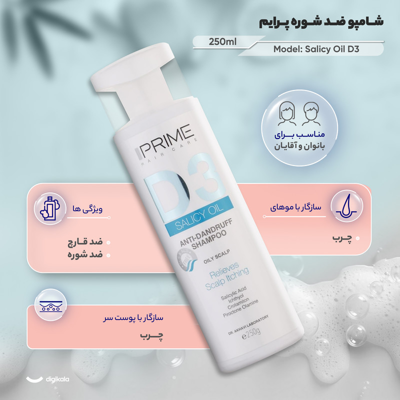 شامپو ضد شوره پریم مدل Salicy Oil D3 با حجم 250 میلی لیتر، یک محصول بی نظیر و موثر برای موهای چرب است که در ایران تولید می شود. این شامپو با استفاده از عصاره های طبیعی گلدیتسیا، گزنه و جینسینگ، به شما کمک می کند تا شوره های مقاوم به درمان و شوره چرب را مهار کنید. این محصول با تنظیم ترشح چربی غدد سباسه و لایه برداری ملایم، پوست سر را پاکسازی کرده و خارش و التهاب را کاهش می دهد. شامپو ضد شوره پریم مدل Salicy Oil D3 فاقد پارابن و سیلیکون است، بنابراین می توانید با اطمینان از آن استفاده کنید. این شامپو برای بانوان و آقایان مناسب است و با ویژگی های ضد شوره و تنظیم چربی، موهای شما را سالم و درخشان نگه می دارد. برای استفاده از این شامپو، مقدار مناسبی از آن را روی موهای خیس خود بمالید و به آرامی ماساژ دهید تا کف کند. سپس به مدت 2 تا 3 دقیقه صبر کنید تا ترکیبات موثر شامپو به خوبی جذب شوند. در نهایت، موهای خود را به طور کامل با آب ولرم بشویید. برای بهترین نتیجه، این شامپو را به صورت منظم و حداقل دو بار در هفته استفاده کنید. با استفاده از شامپو ضد شوره پریم مدل Salicy Oil D3، موهایی سالم، بدون شوره و درخشان داشته باشید و از زیبایی طبیعی خود لذت ببرید. این محصول با اثر بخشی موثر و مستمر، انتخابی عالی برای حفظ سلامت و زیبایی موهای چرب شماست.