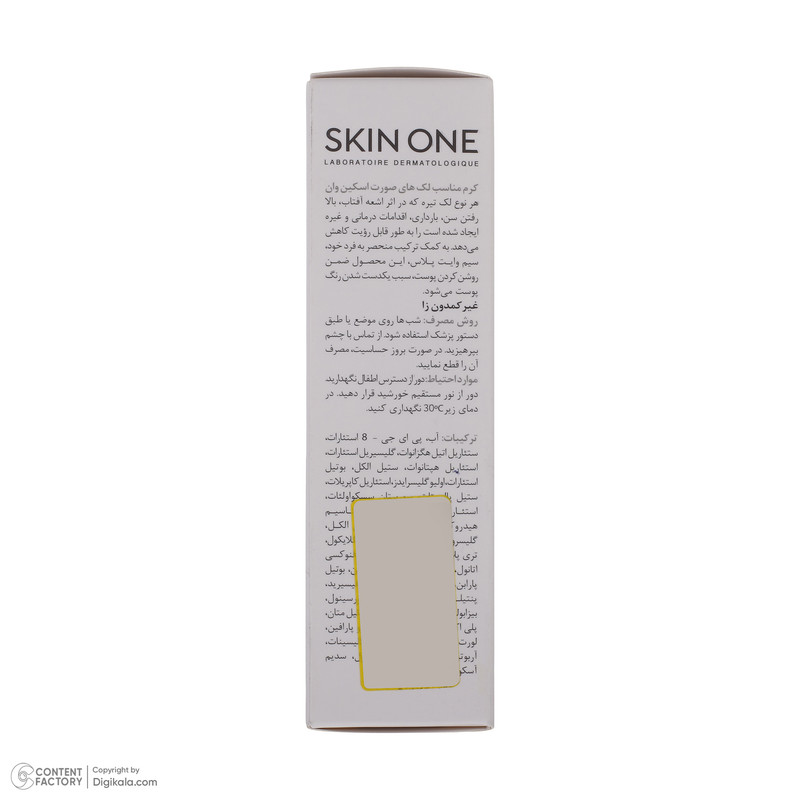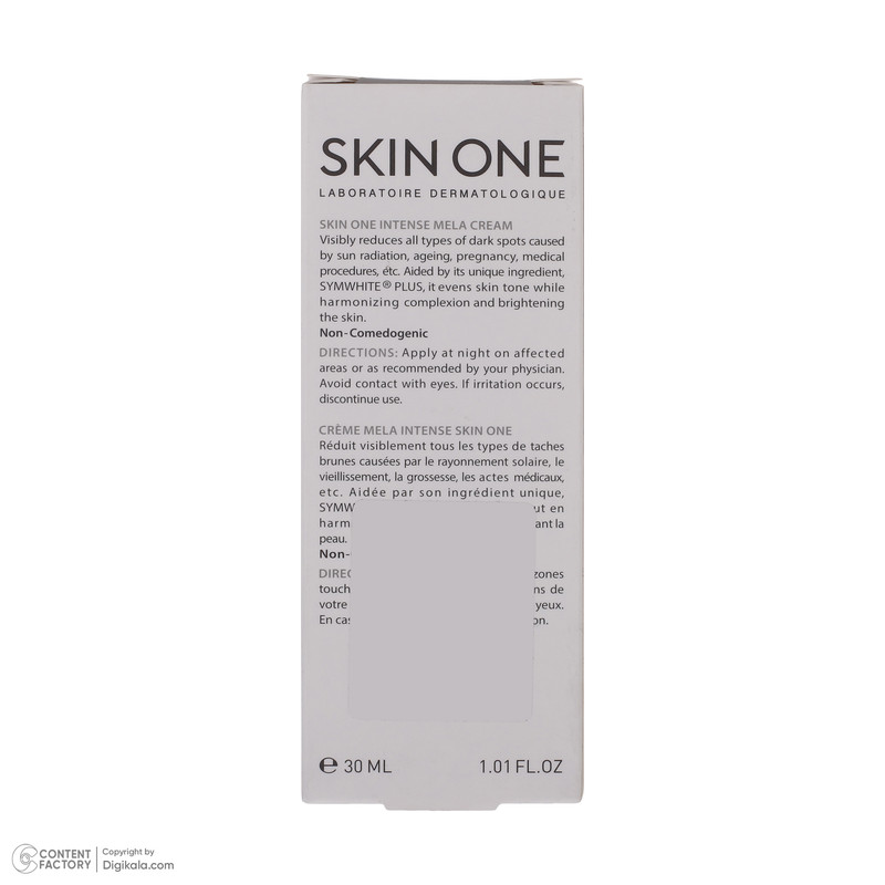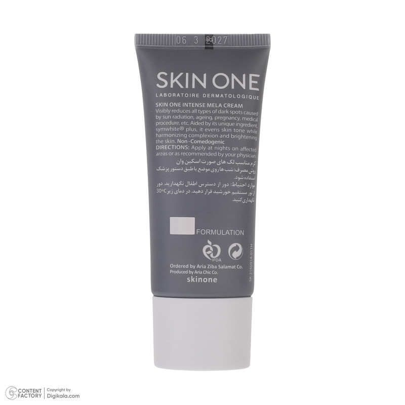 کرم ضد لک ملا اینتنس اسکین وان، رفع کننده لکهای تیره صورت میباشد و صورتی روشن و یک دست را برای شما به ارمغان میآورد. ملا کرم اینتنس لک های صورت SKIN ONE، هر نوع لک تیره که در اثر اشعه آفتاب، بالا رفتن سن، بارداری، اقدامات درمانی و غیره ایجاد شده است را به طور قابل رویت کاهش میدهد. این محصول به کمک ترکیب منحصر به فرد خود، سیم وایت پلاس، ضمن روشن کردن پوست، سبب یکدست شدن رنگ پوست نيز میشود. از سایر ویژگی های این کرم ضد لک میتوان به کاهش تولید ملانین، خاصیت آنتی اکسیدان و لایهبرداری اشاره کرد. کرم ضد لک اسکین وان مناسب انوع پوست میباشد و غیر کمدون زا است. ملا کرم اینتنس اسکین وان تولید ایران است و دارای فرمولاسیون فرانسوی میباشد.