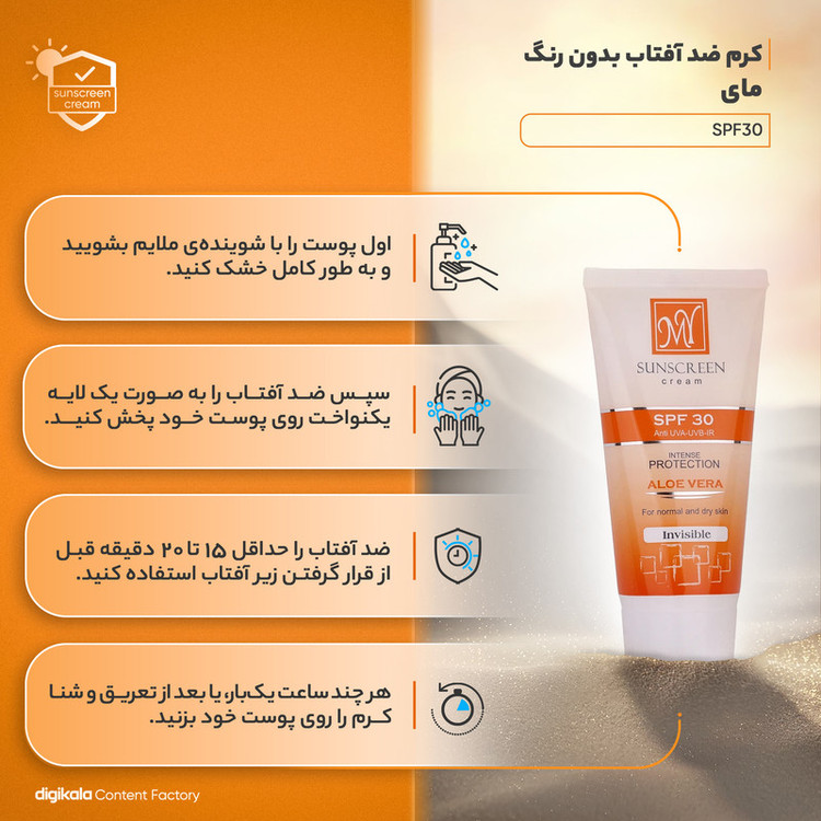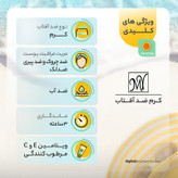 ویژگیهای ضدآفتاب : ضد آب , محافظت کننده در برابر اشعه UVA , محافظت کننده در برابر اشعه UVB , مرطوب کننده
