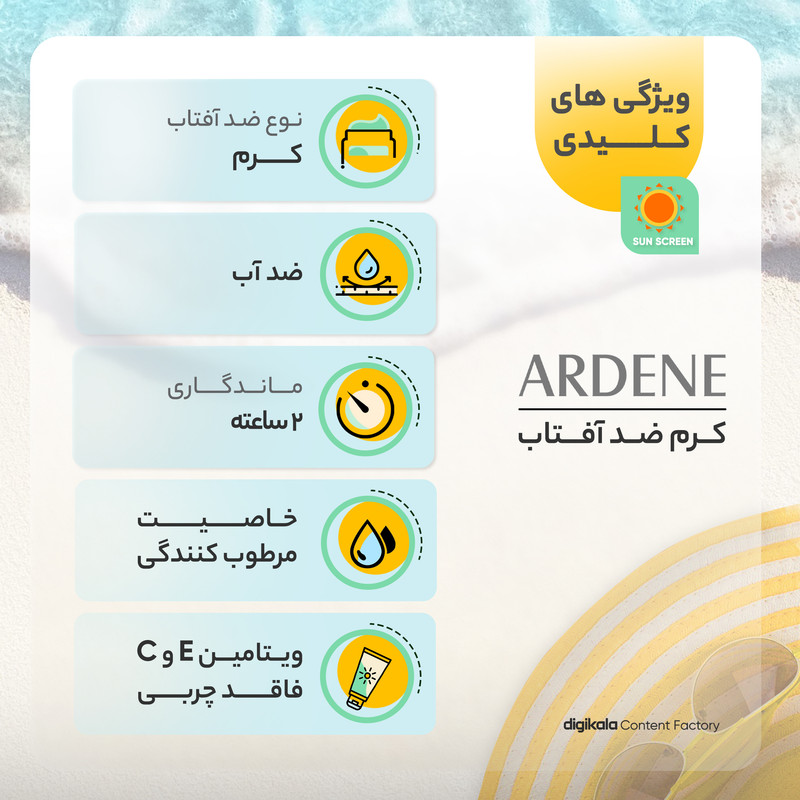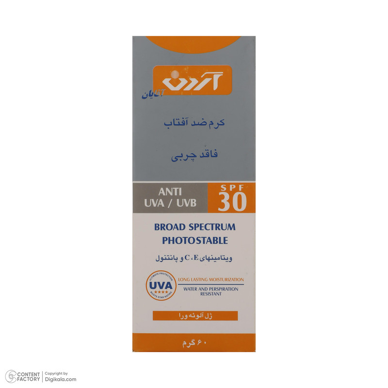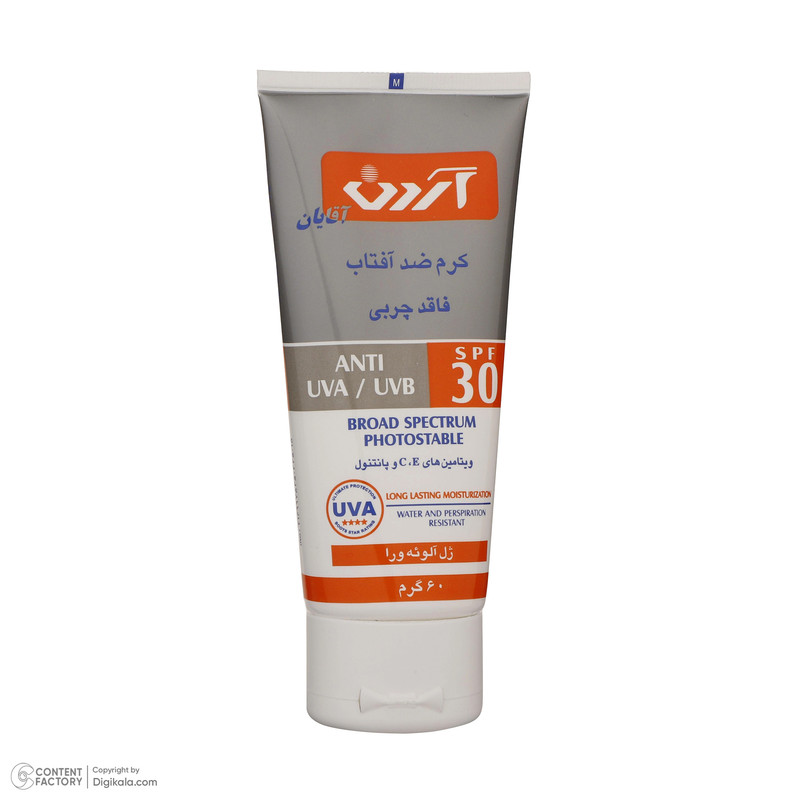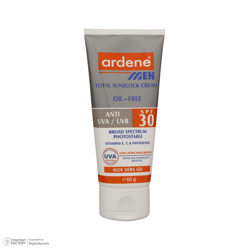 کرم ضد آفتاب بدون رنگ آقایان آردن با SPF30 مناسب آقایان است. این محصول با توجه به تفاوتهای اساسی فیزیولوژیکی که بین پوست آقایان و خانمها وجود دارد، برای اولین بار در ایران طراحی و تولید گردیده است. این ضدآفتاب فاقد روغنهای معدنی و ترکیبات چرب بوده از همین رو بدون اثر سفید کنندگی و براقیت بر روی پوست، قدرت حفاظتی کامل در تمام طول موجهای پرتوی ماوراء بنفش دارد. این ضد آفتاب 50 گرمی دارای مواد مرطوب کننده مؤثر پوست بوده و در برابر نور و تعریق مقاوم است. همچنین حاوی ژل آلوئه ورا جهت التیام بخشی و ترمیم پوست بوده و با وجود ویتامین C و E بعنوان یک آنتی اکسیدان قوی و محافظ در برابر تشکیل رادیکالهای آزاد روی پوست عمل میکند. از آنجاییکه پوست آقایان ضخیمتر از پوست خانمهاست، این ضدآفتاب اثر نفوذپذیری بیشتری به پوست داشته و به همین دلیل هم بهتر است که خانمها از این محصول استفاده نکنند؛ چرا که در صورت نازک و یا حساس بودن احتمال اثرگذاری منفی روی پوست وجود خواهد داشت.